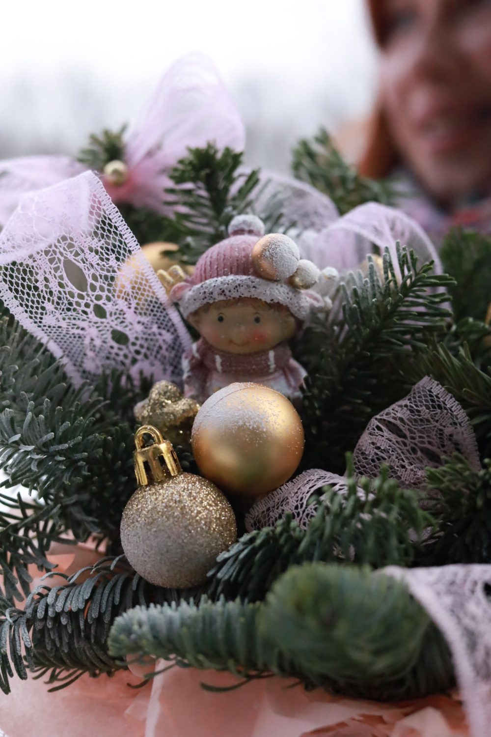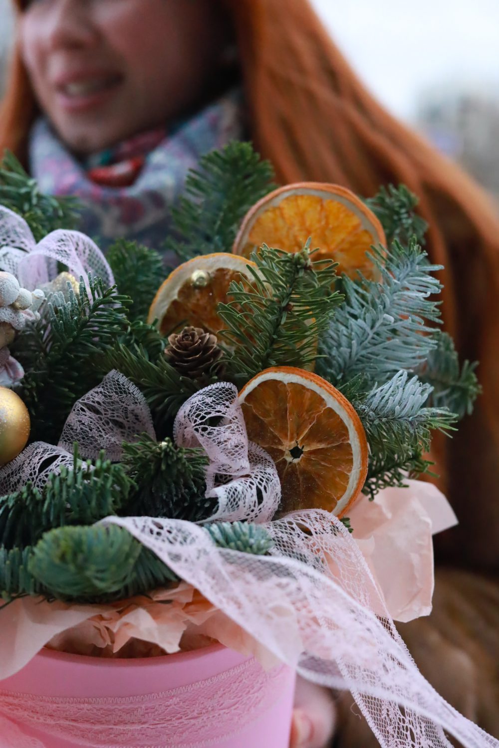 Милая авторская композиция с апельсинами, милой керамической фигуркой и декором.