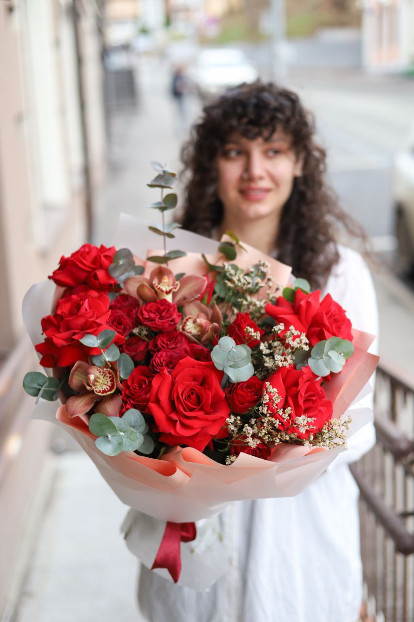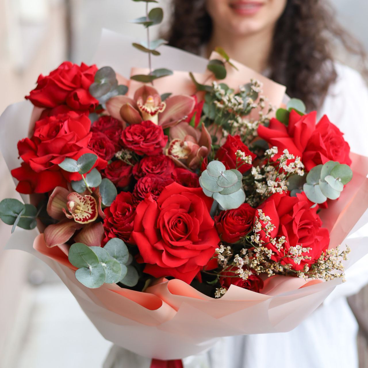 Букет с французской розой, орхидеей, кустовой розой, лимониумом и эвкалиптом в оформлении.
