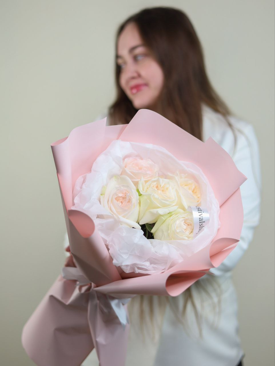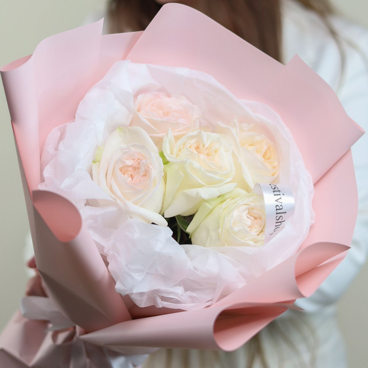 Букет из 5-ти пионовидных роз Охара в оформлении.
