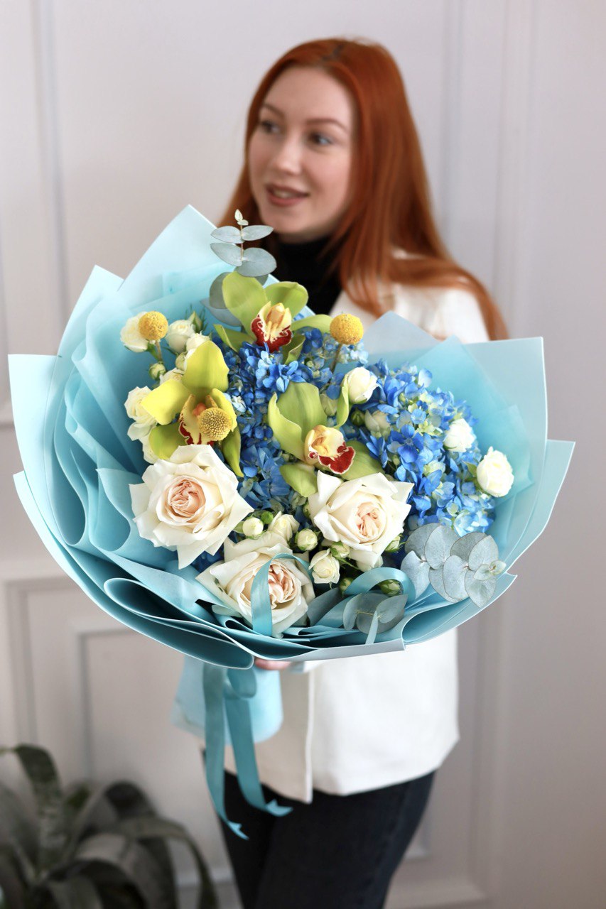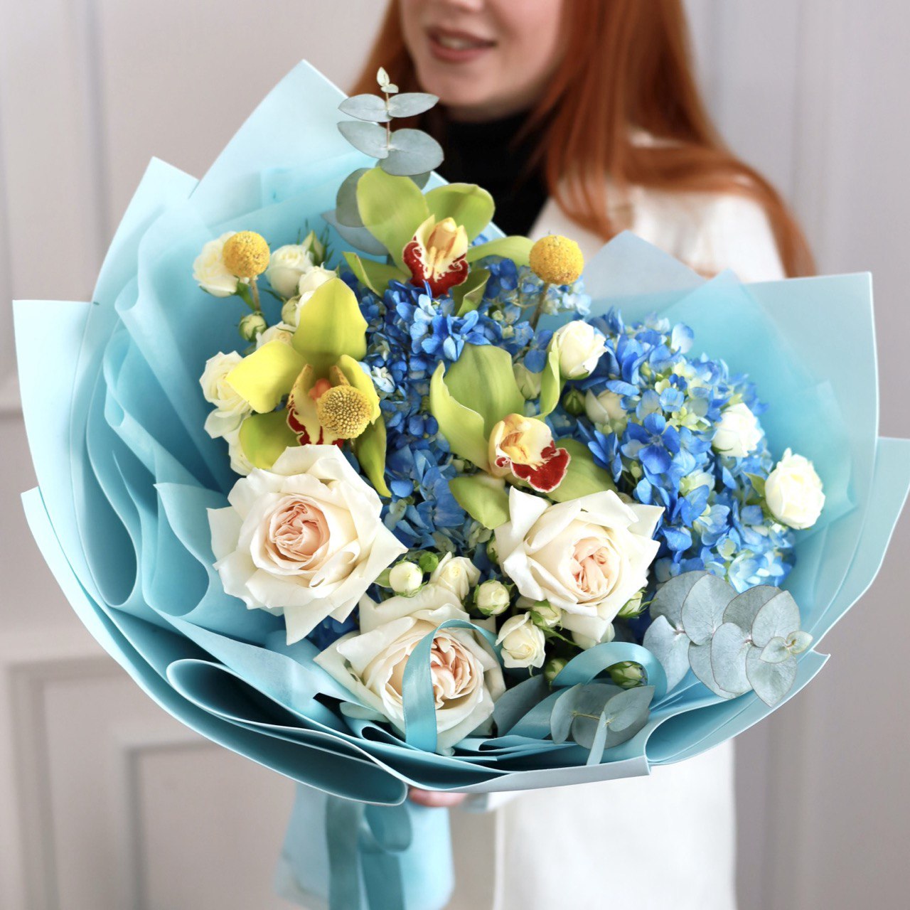 Состав: Орхидеи, гортензии, кустовые розы, пионовидные розы, краспедия, эвкалипт