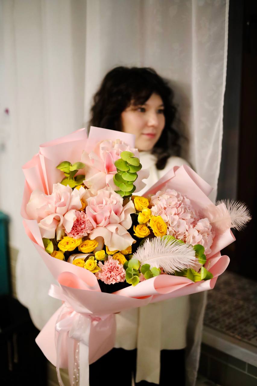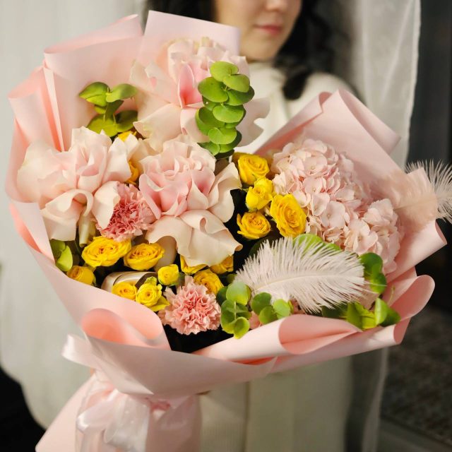 В букете: кустовые и французские розы, пышная гортензия, стойкие диантусы, перья и эвкалипт.