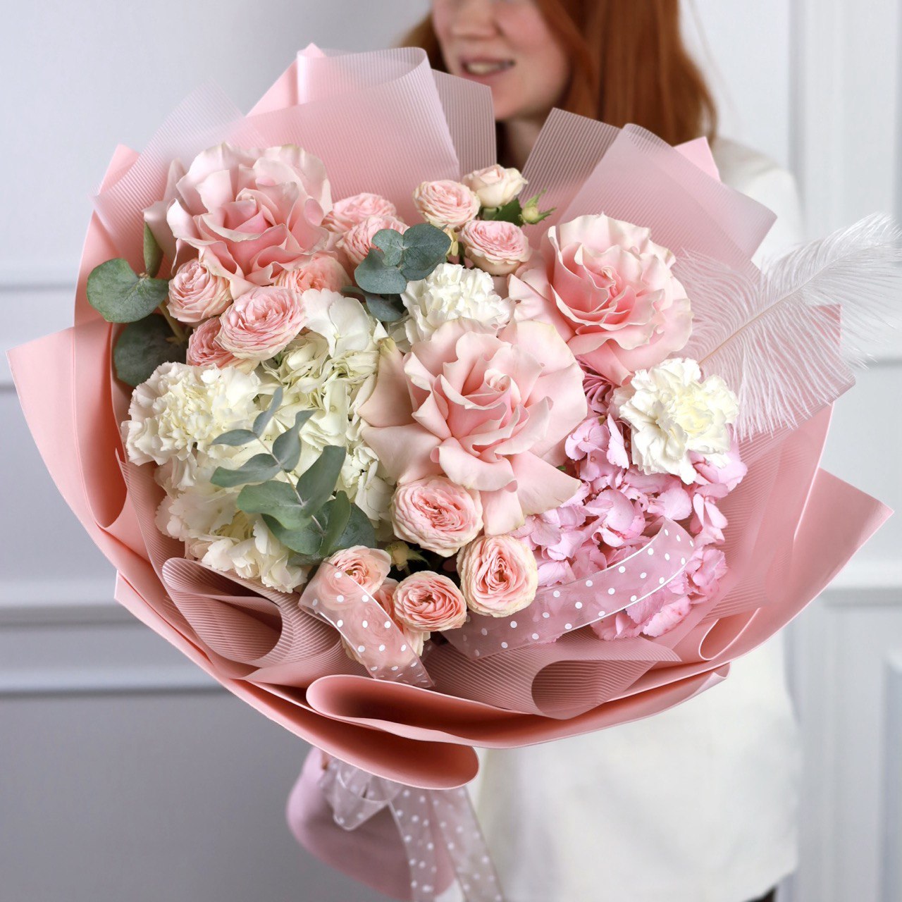 Состав: Французские розы, гортензии, диантусы, кустовые пионовидные розы, эвкалипт