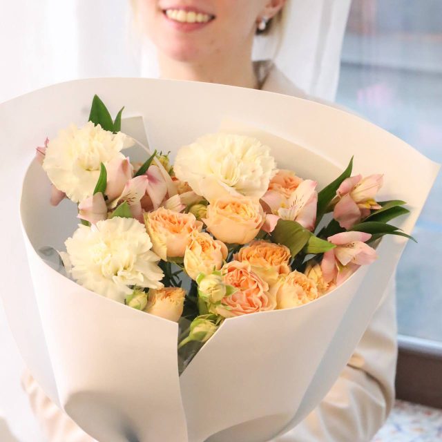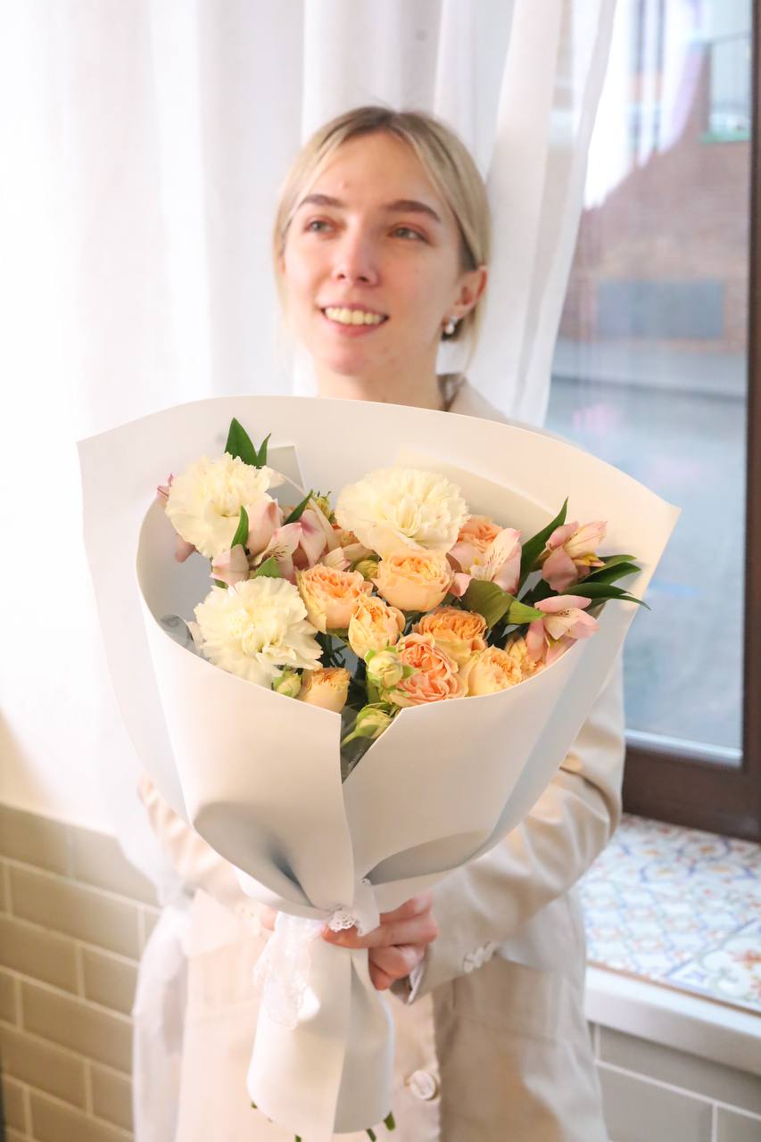 Букет кустовых роз, альстромерий и стойких диантусов в оформлении.