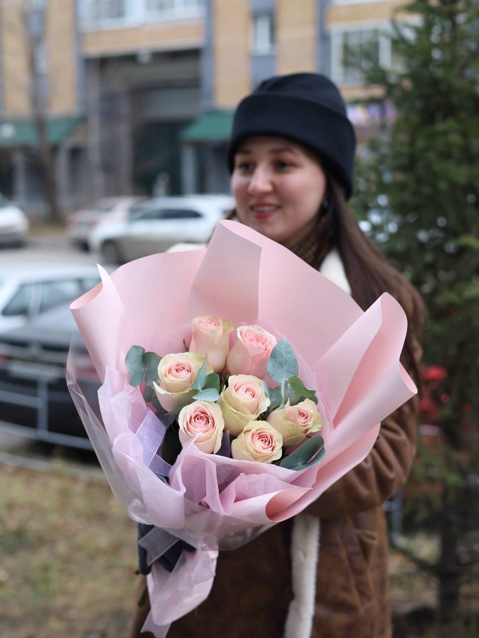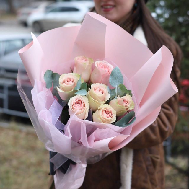 Очаровательный букет из 7 роз с крупным бутоном и эвкалипта в оформлении.