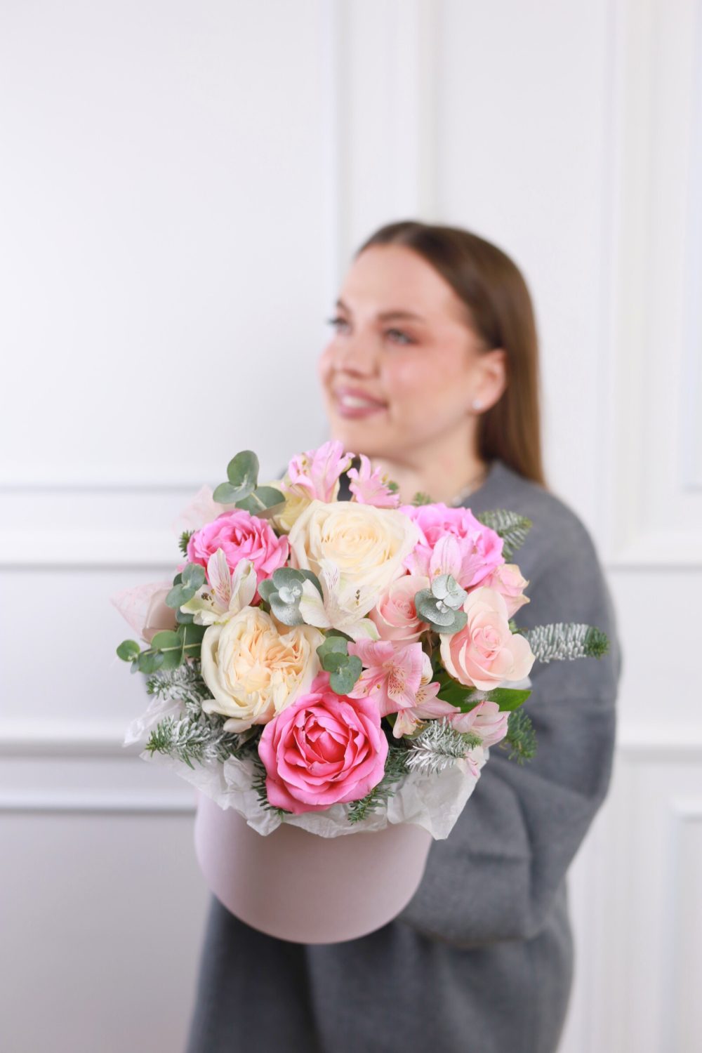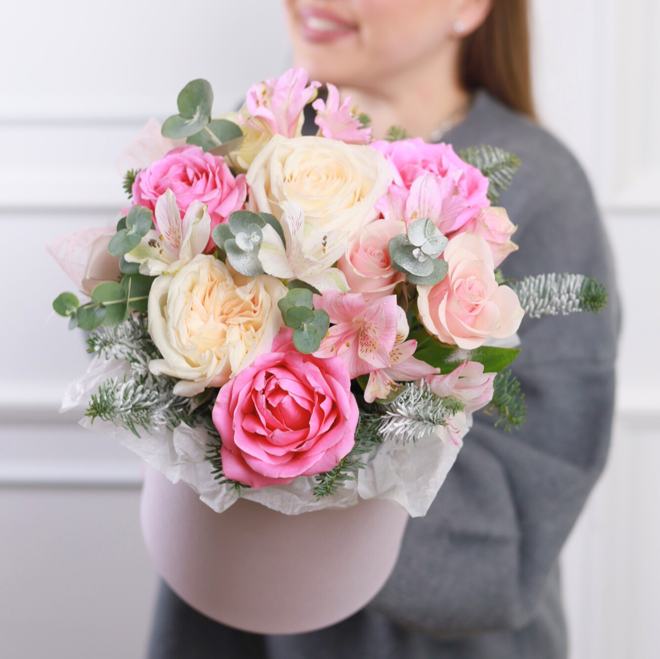 Прекрасная композиция с розами, альстромерией, елью и эвкалиптом.