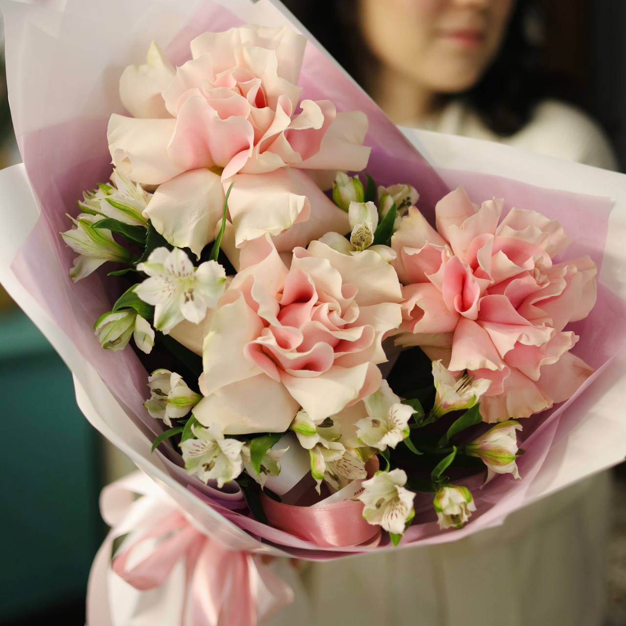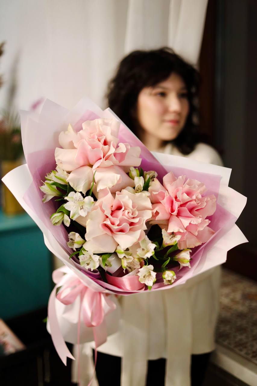 Очаровательный букет в бело-розовой гамме в стильном оформлении.