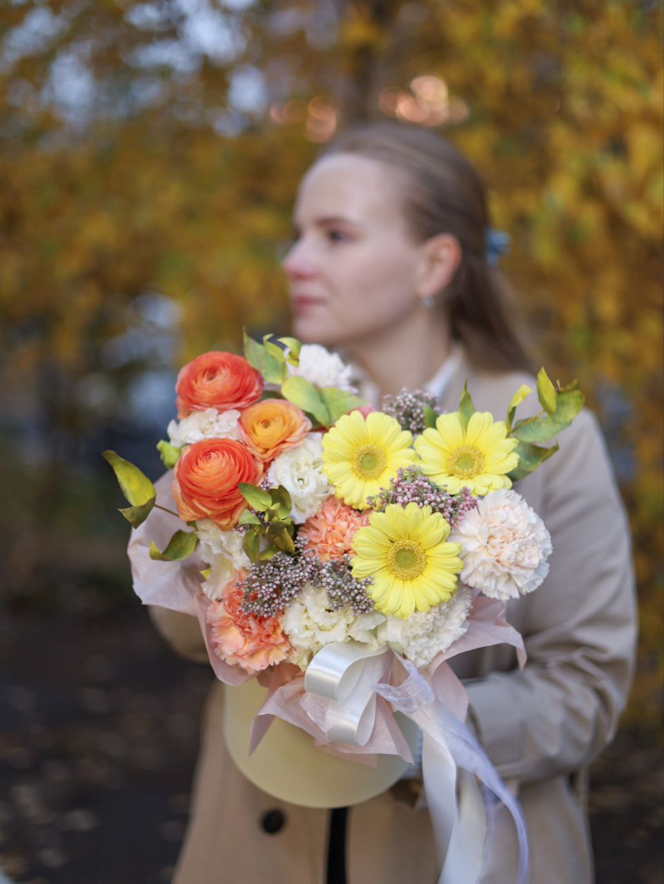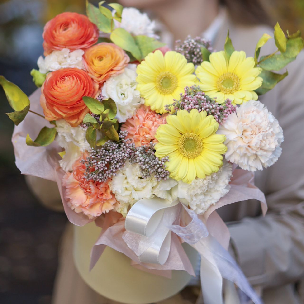 Композиция с ранункулусам, герберой, ажурной эустомой и стойким диантусом в оформлении.