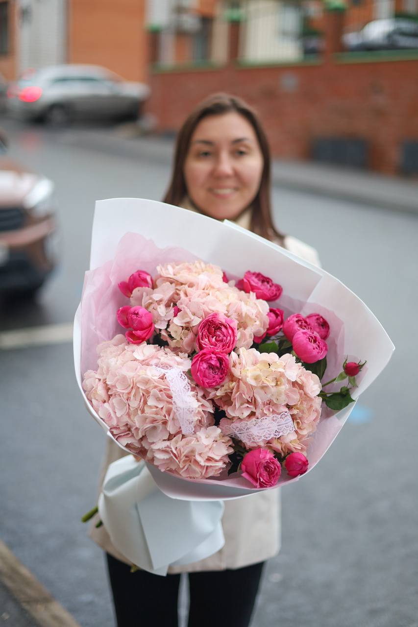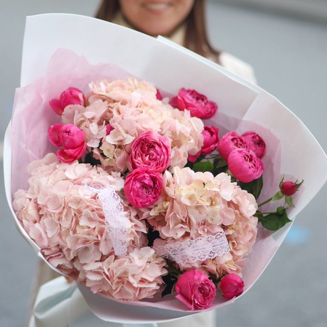 Букет пышных гортензий и кустовых пионовидных роз в оформлении.
