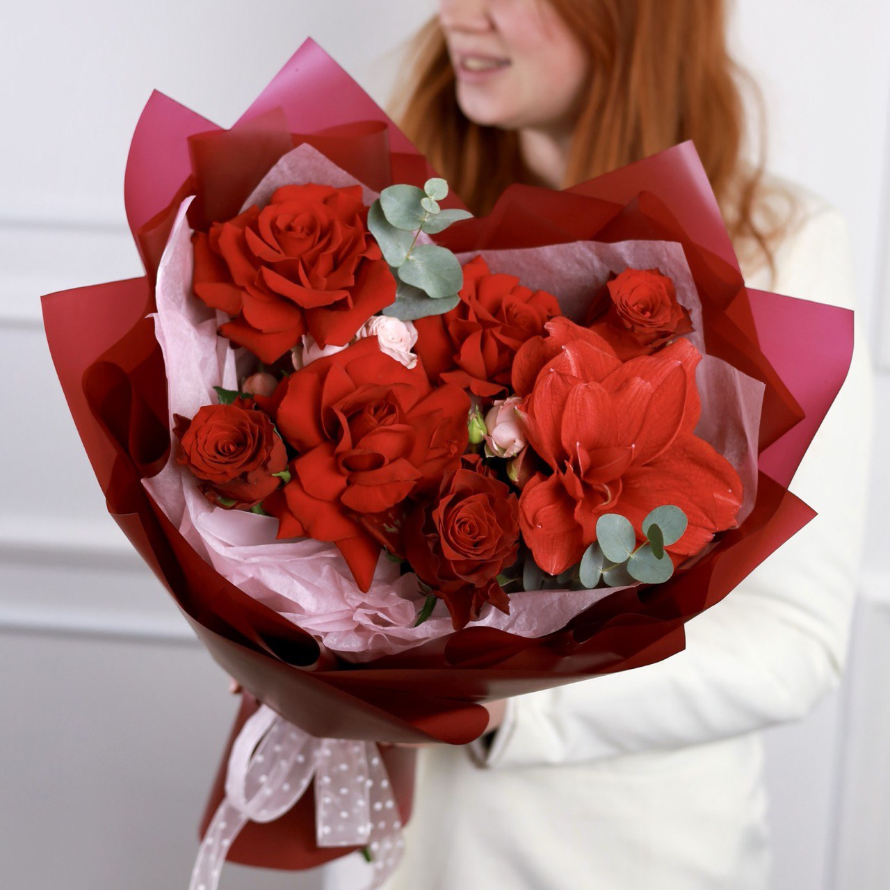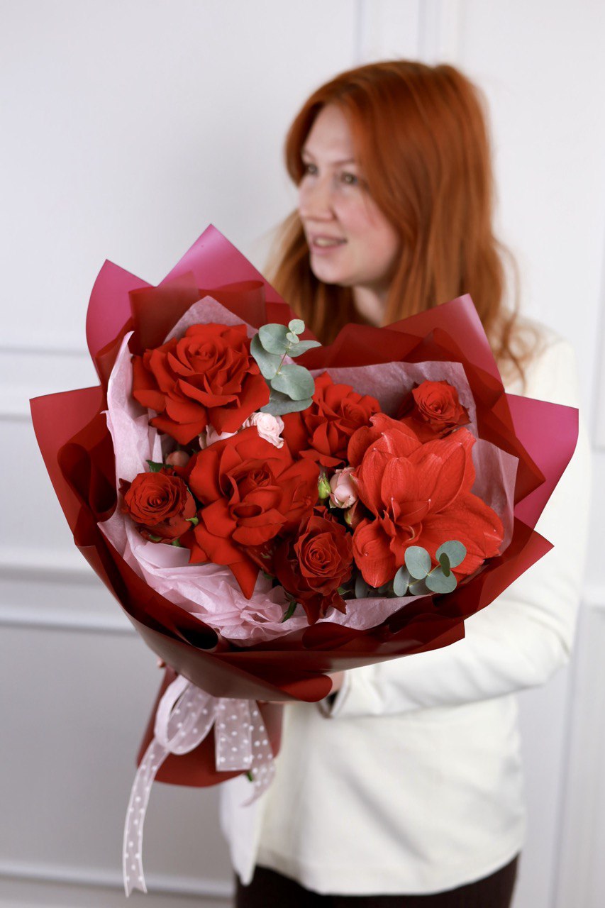 Состав: французские розы, амариллис, одноголовые розы, кустовые розы и эвкалипт