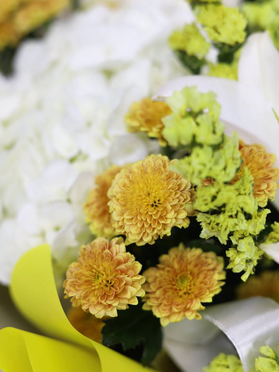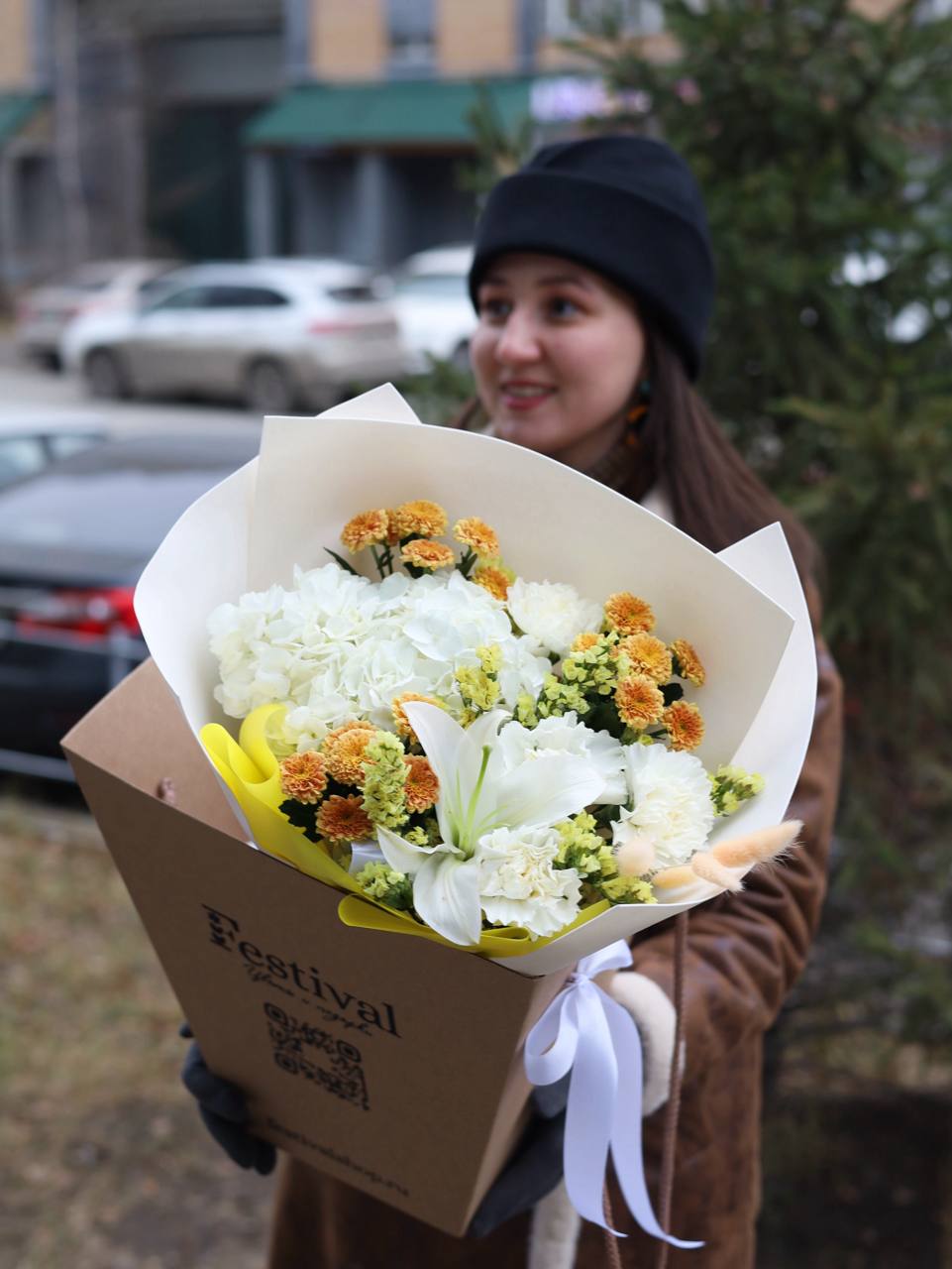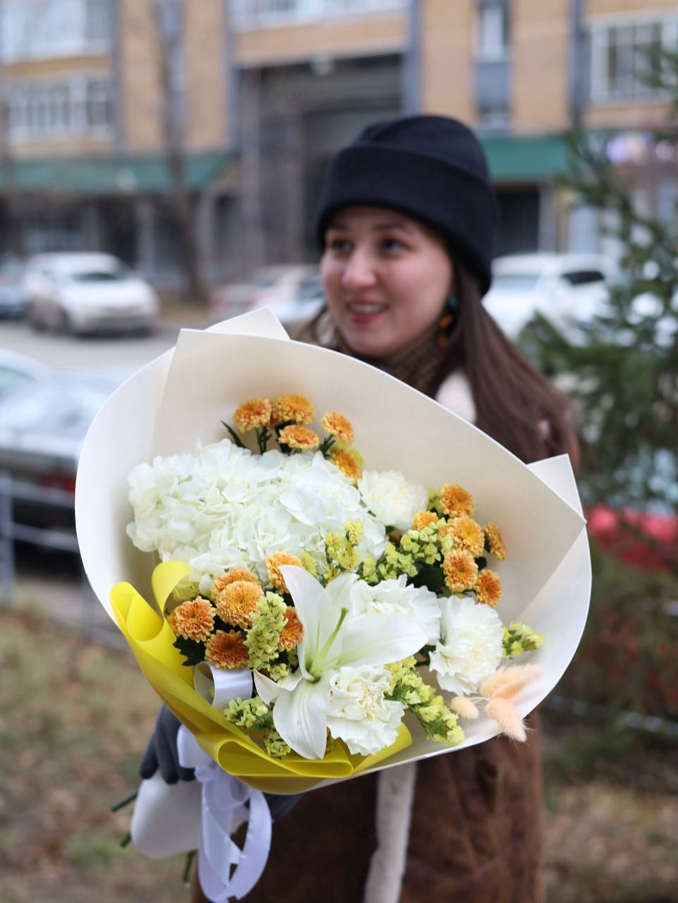 Красивый букет с гортензией, хризантемой сантини, желтой статицей, диантсуами и ароматной лилией.