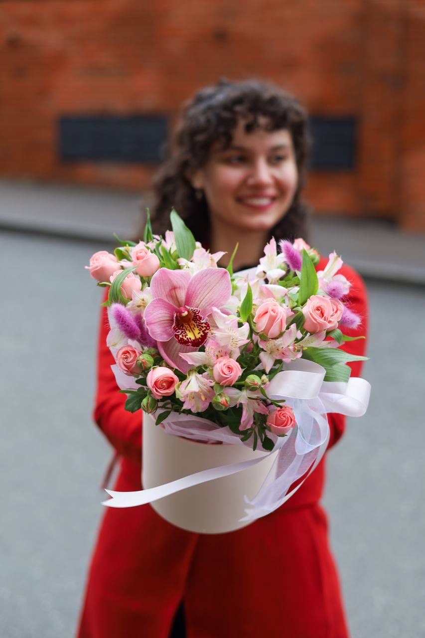 Стильная композиция с кустовыми розами, орхидеей, альстромерией и сухоцветами.