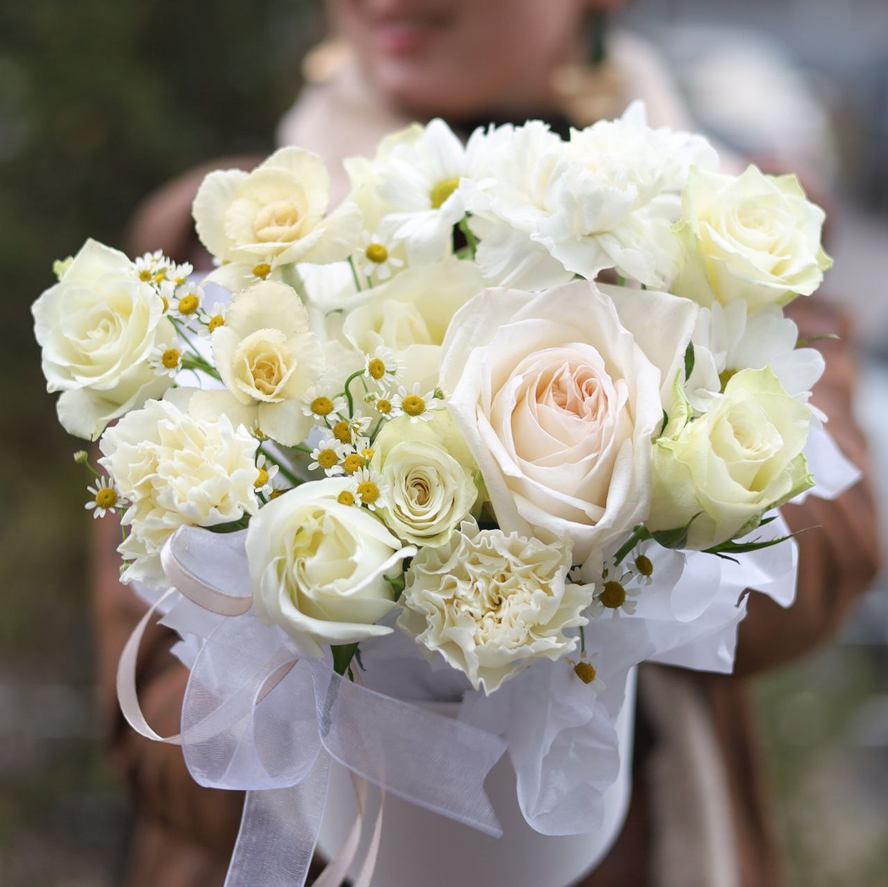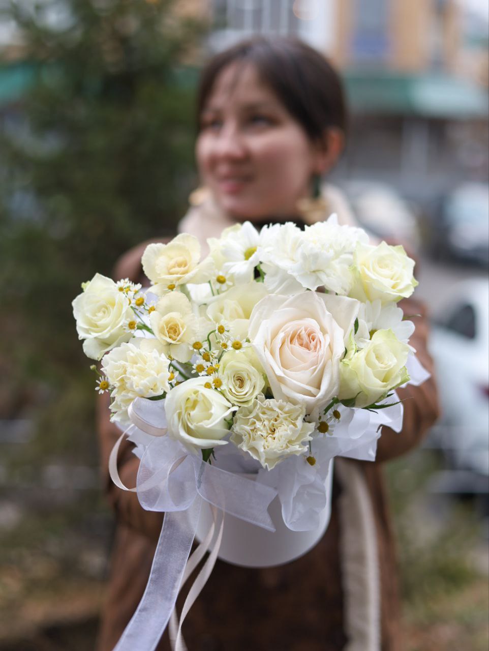 Красивая композиция с пионовидной розой, ароматной ромашкой, брассикой, розой и стойким диантусом в шляпной коробке.