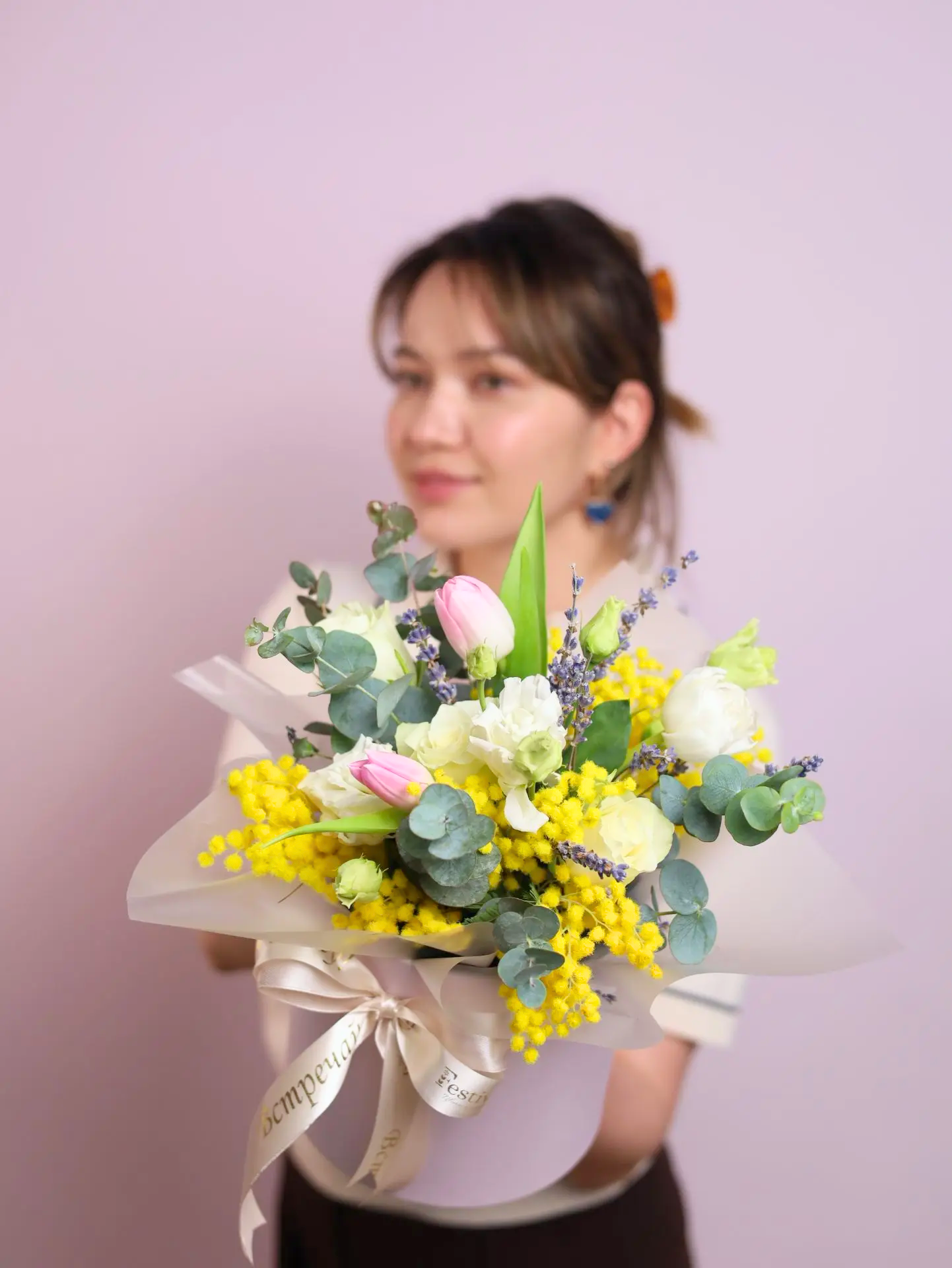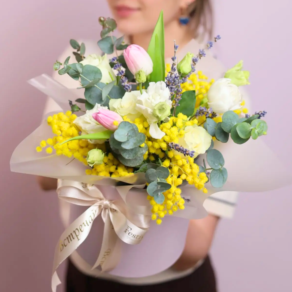 Красивая весенняя композиция с тюльпанами, мимозой, эустомой и розами, эвкалиптом и лавандой.