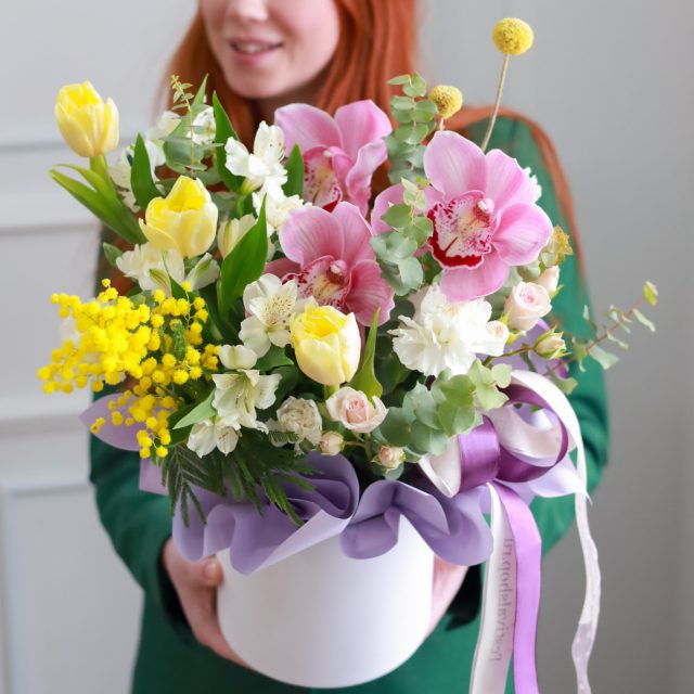 Состав: тюльпаны, кустовые розы, стойкие орхидеи и альстромерия, мимоза, эвкалипт, скабиоза.