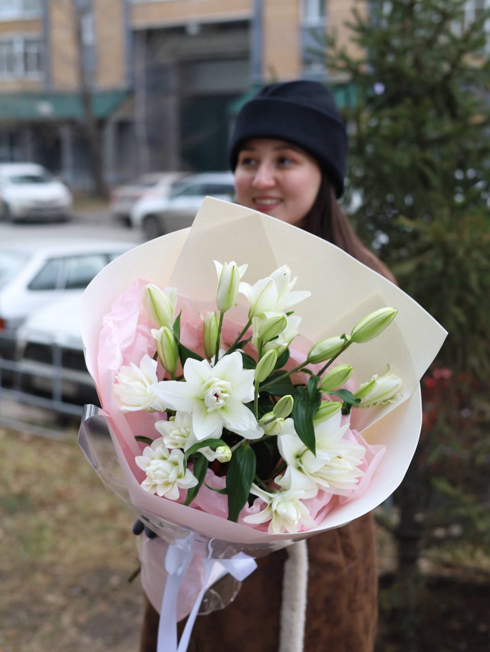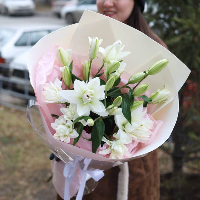 Прекрасный букет из белых пионовидных лилий в оформлении