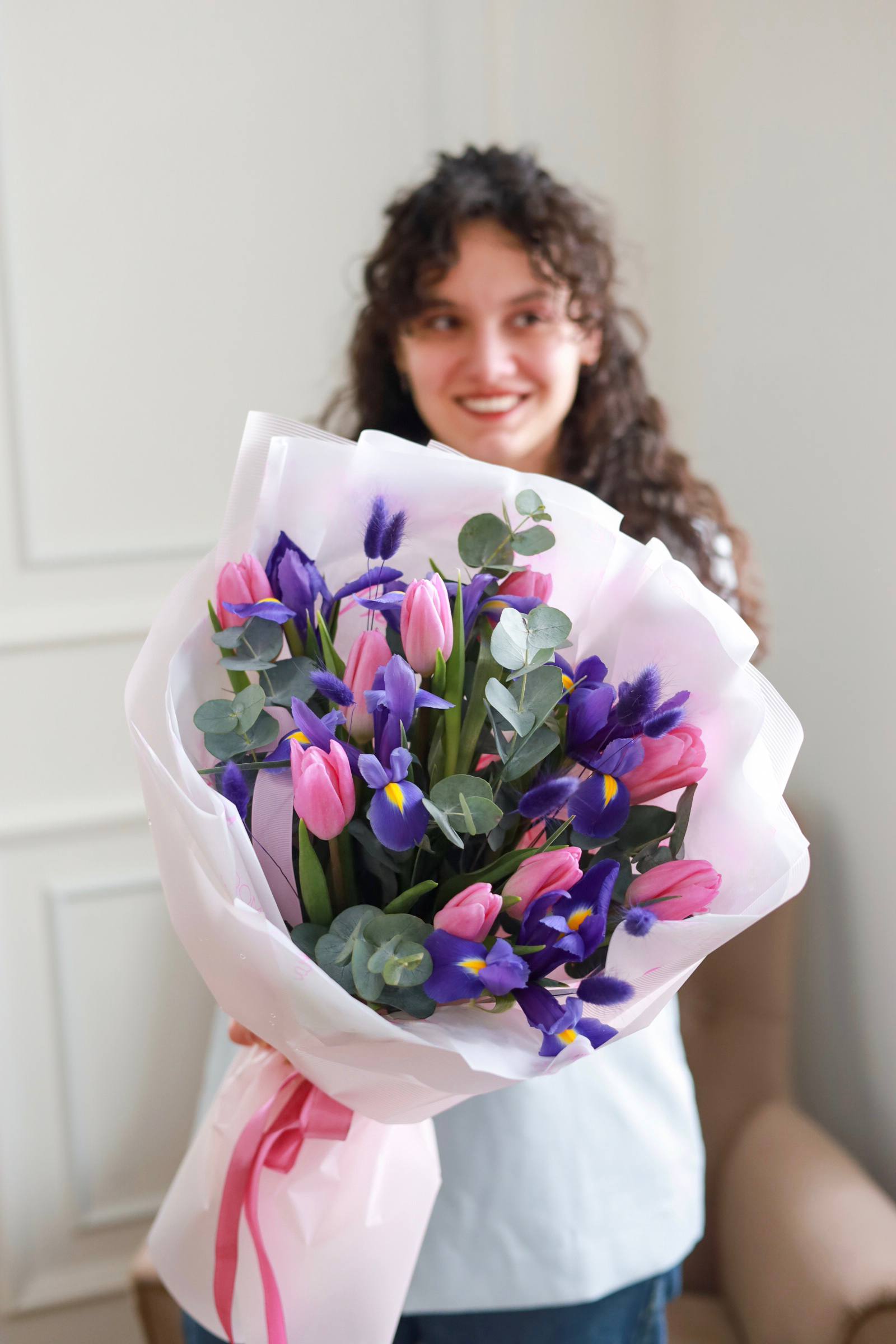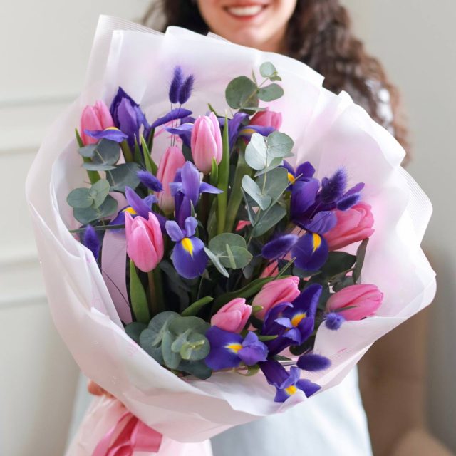 Состав: тюльпаны, ирисы, душистый эвкалипт.