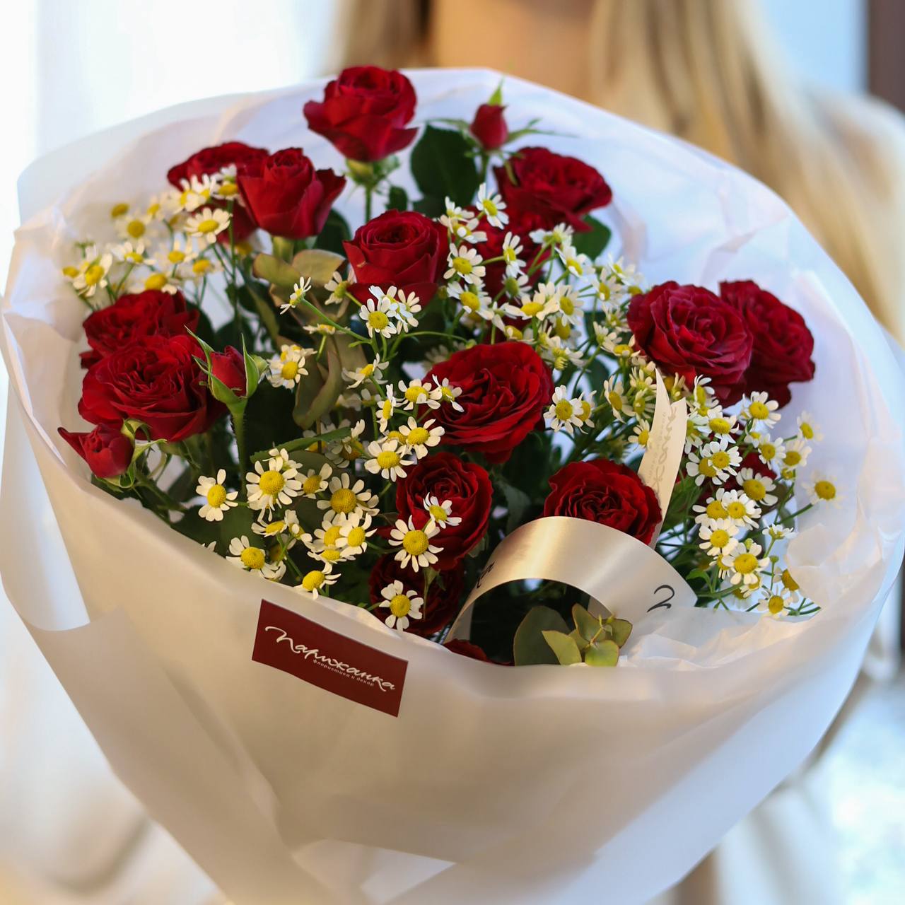 Букет кустовых роз и ароматных ромашек в оформлении.