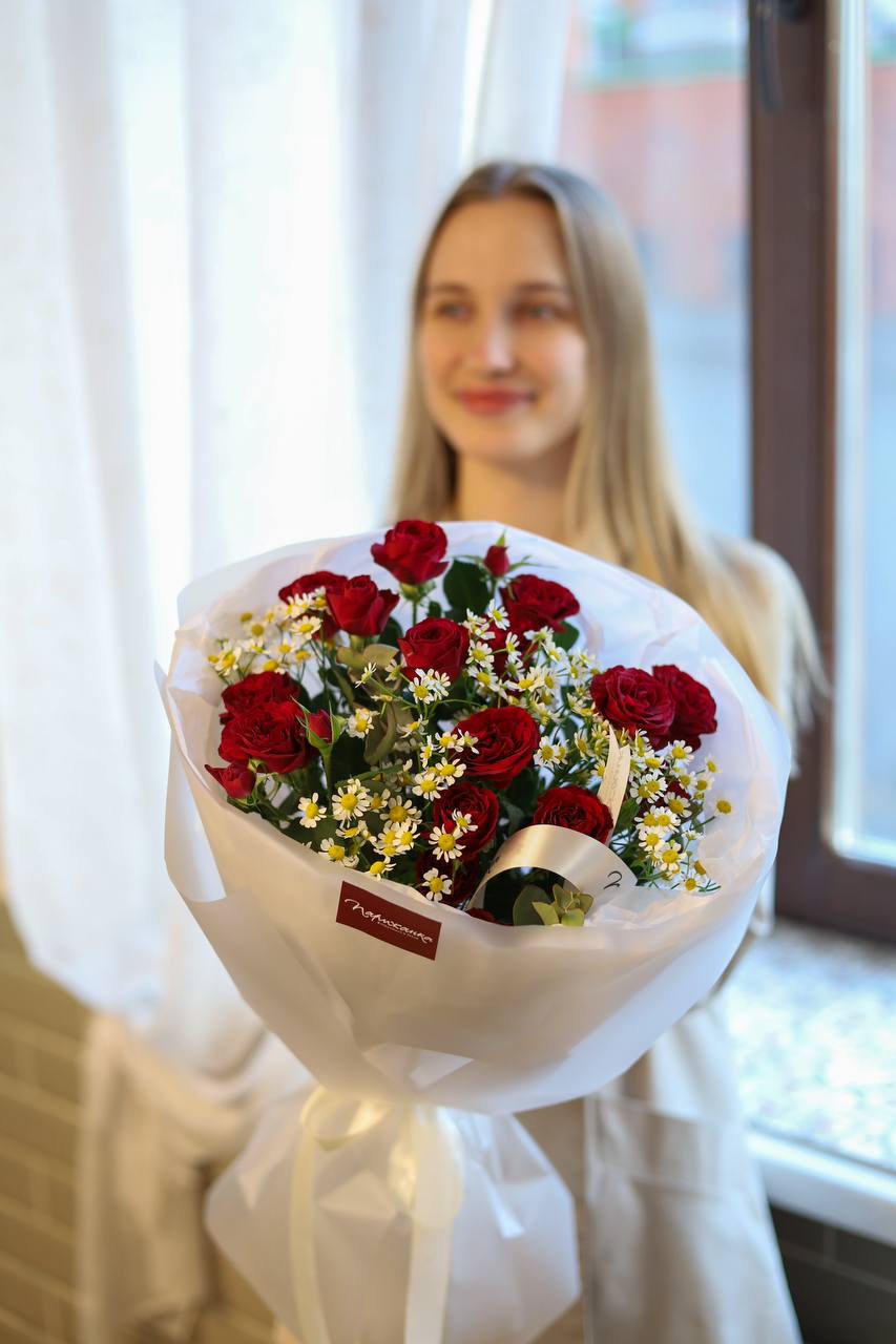 Ароматный букет кустовых роз и ромашек