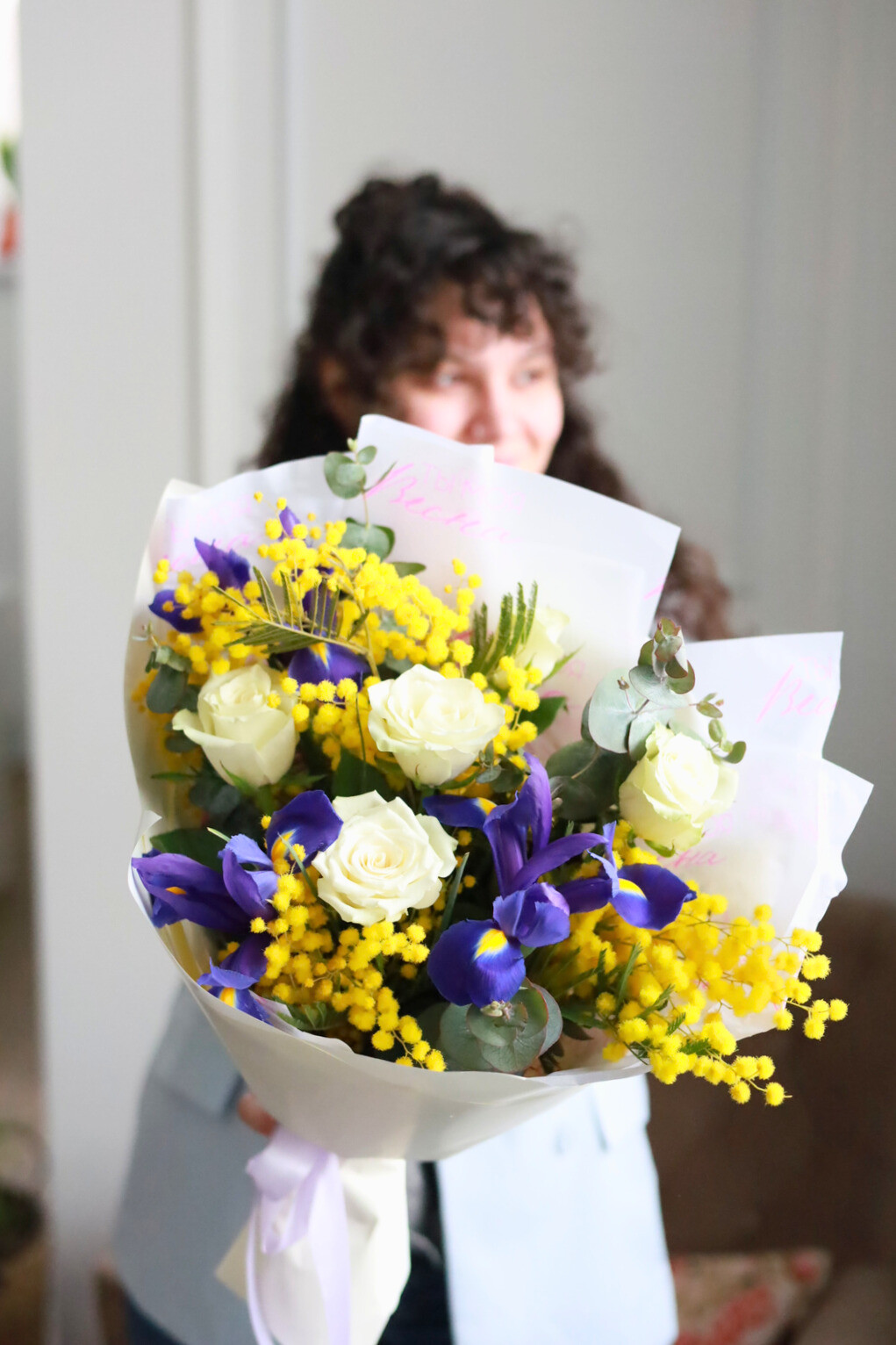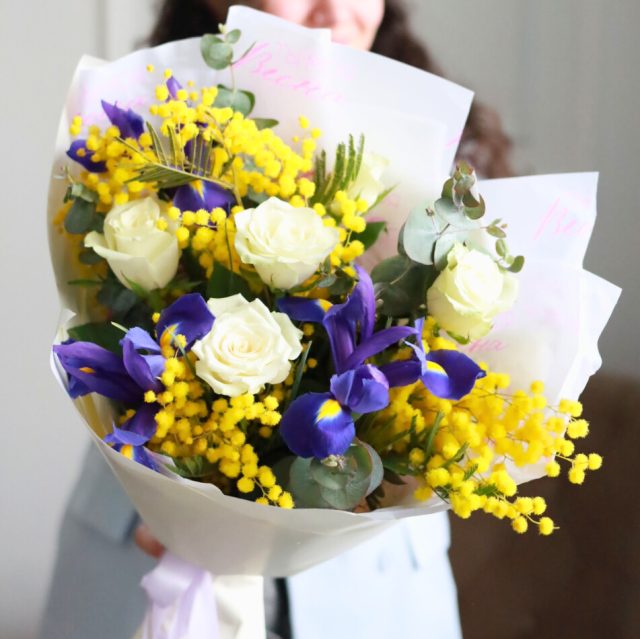Состав: ирисы, одноголовые розы, мимоза, эвкалипт.