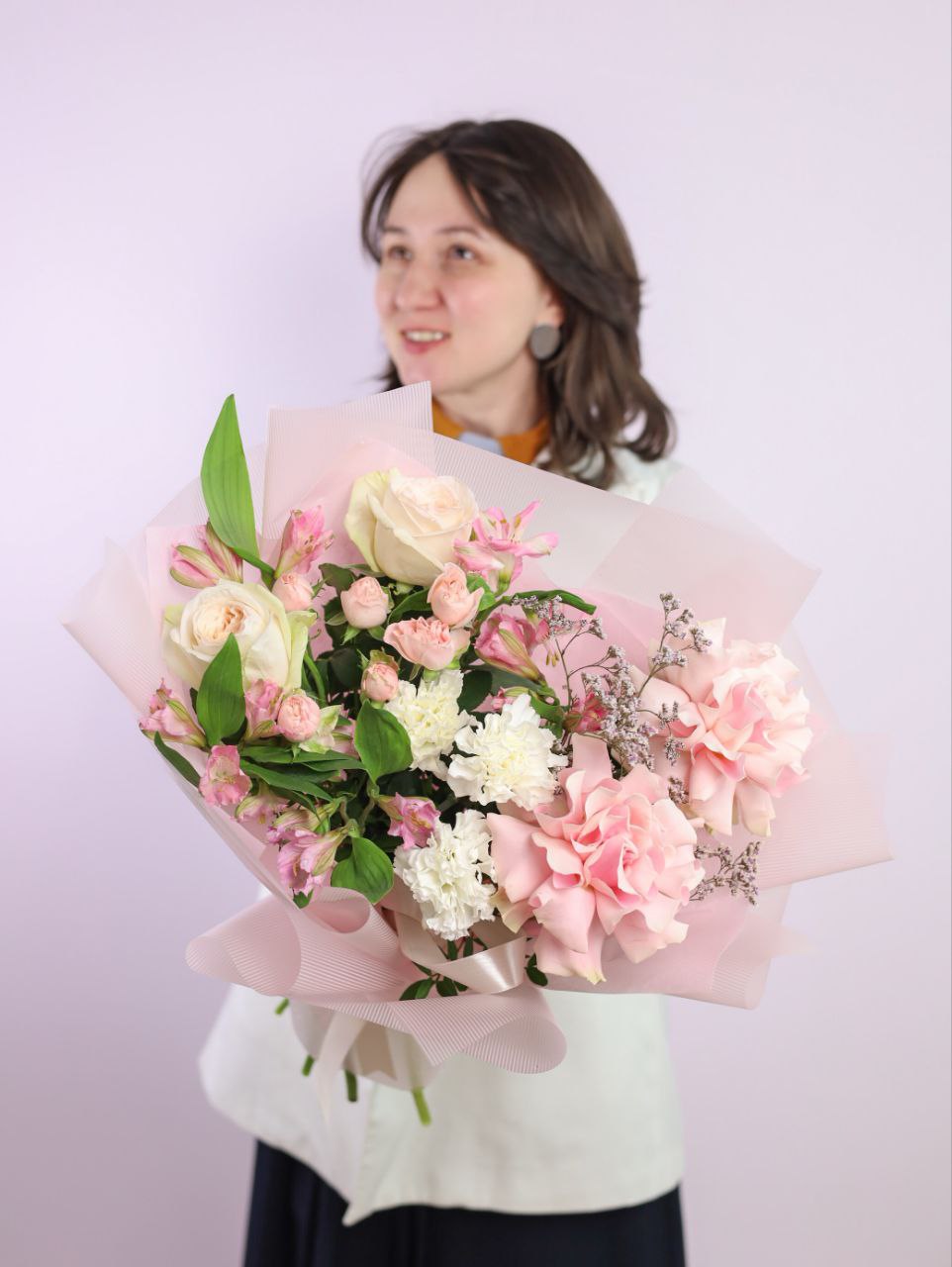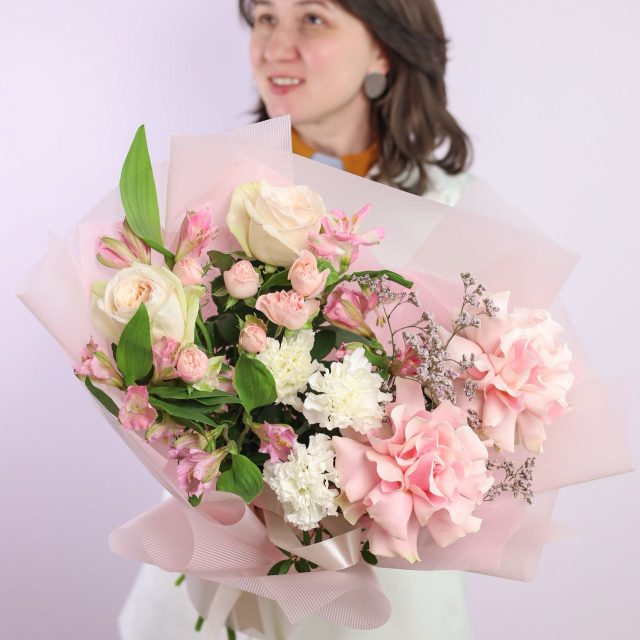 Букет с французской розой, стойким диантусом, ароматной пионовидной розой, пышной альстромерией, пионовидной кустовой розой и лимониумом в оформлении.