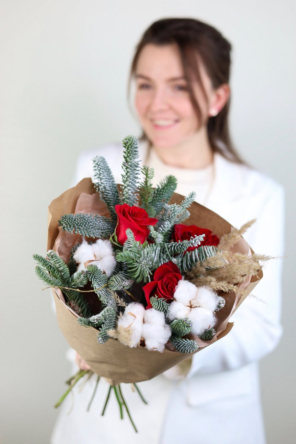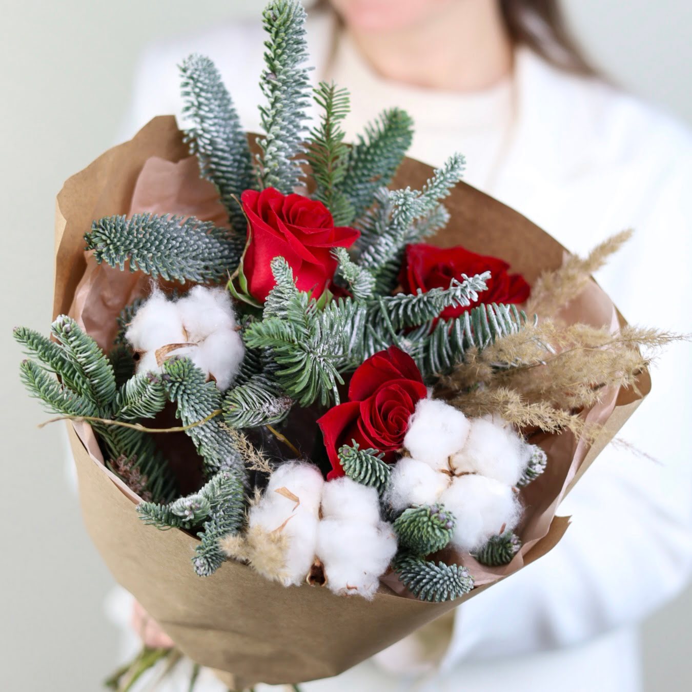 Милый букет с одноголовыми розами, сухоцветами, хлопком и елью нобилис.