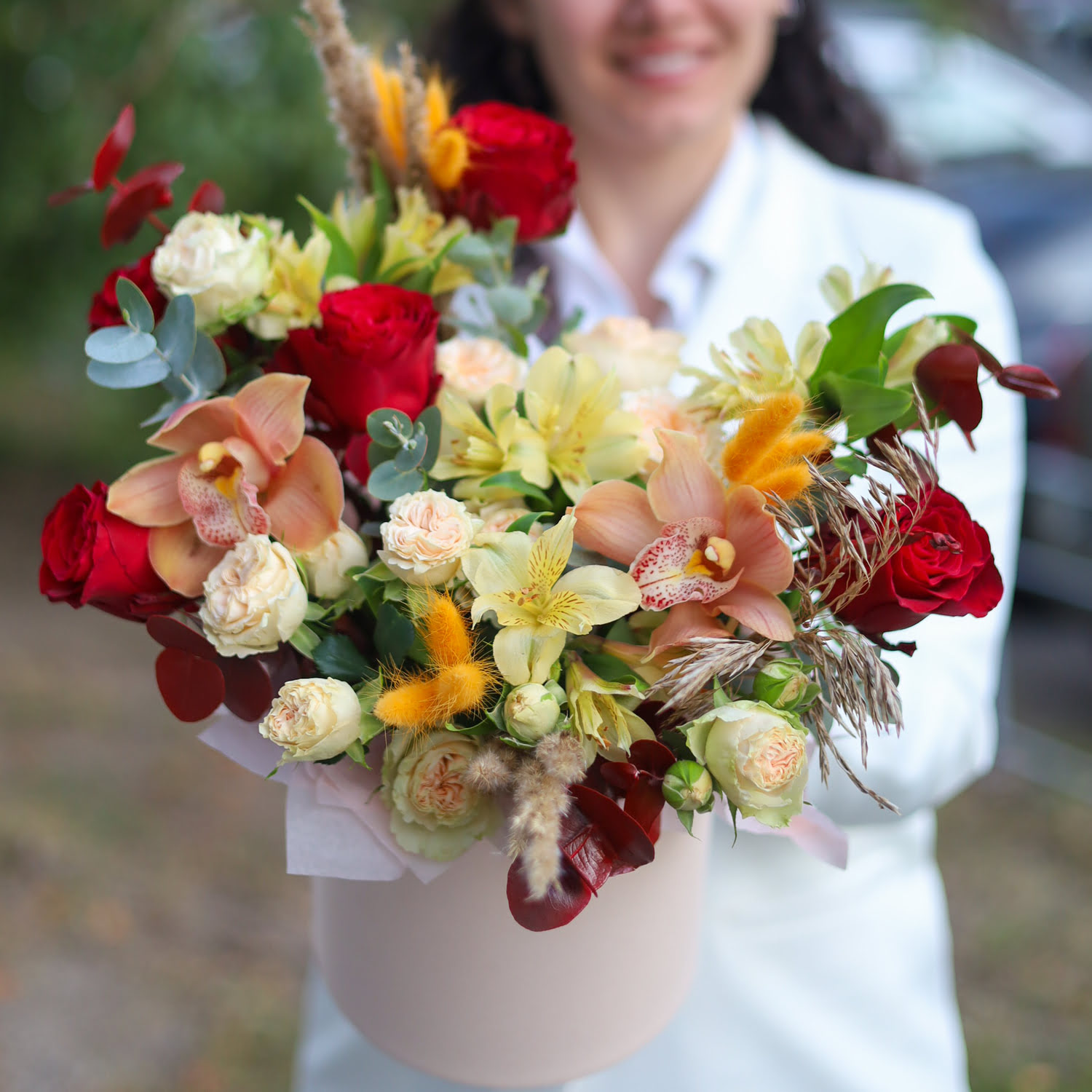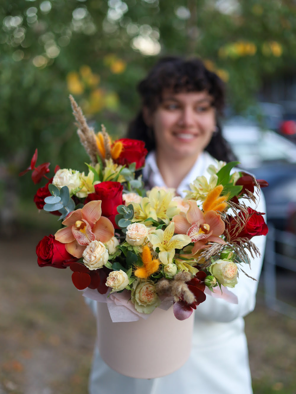 Великолепная раскидистая композиция в осенних красках в шляпной коробке.