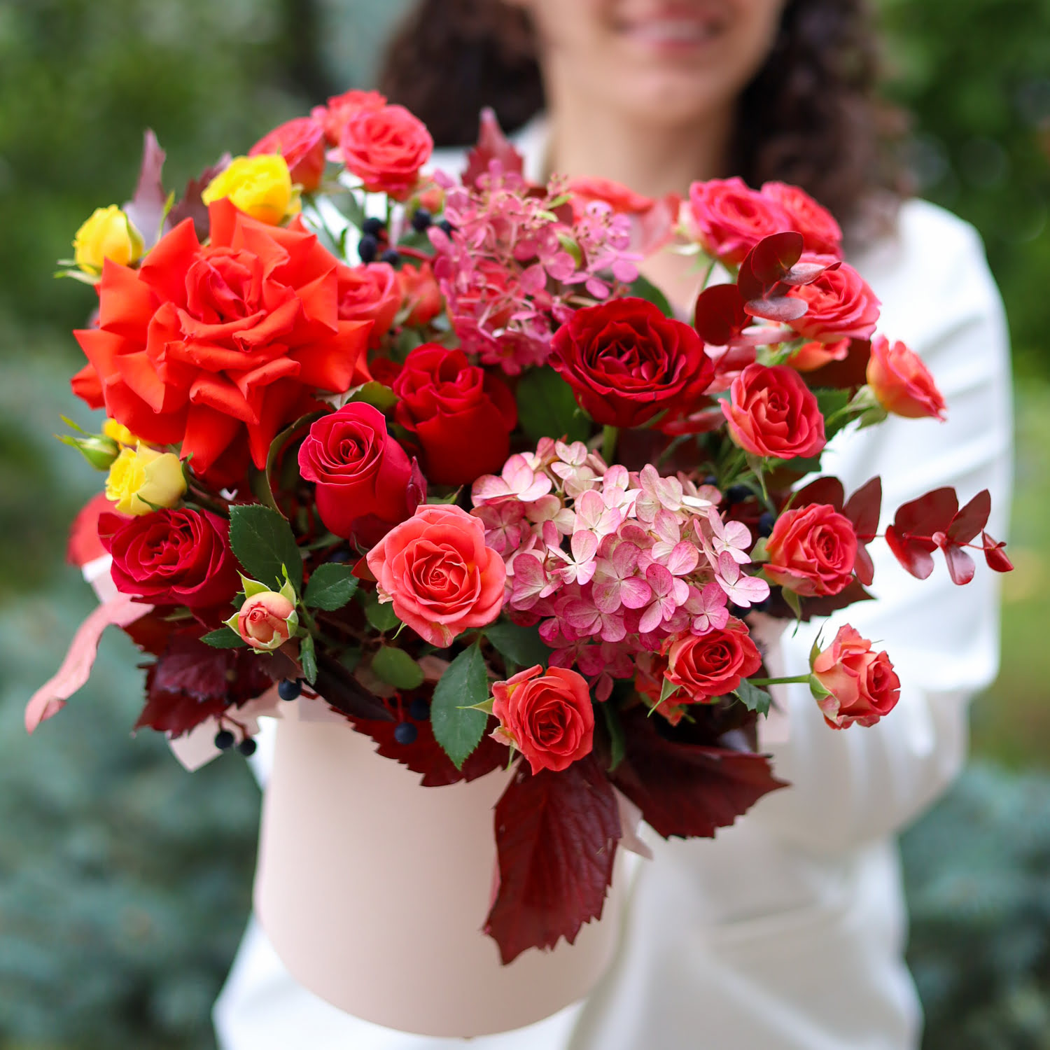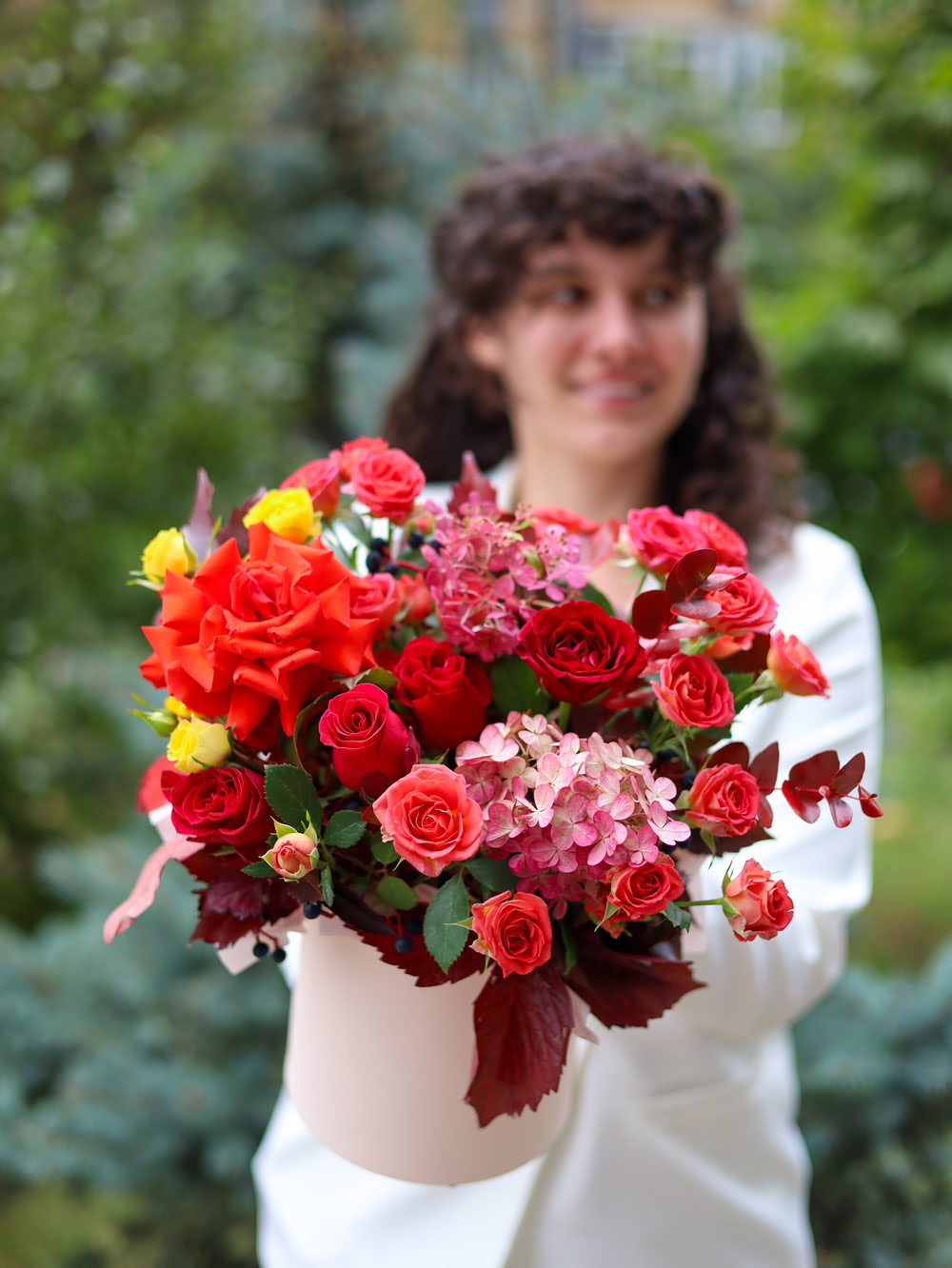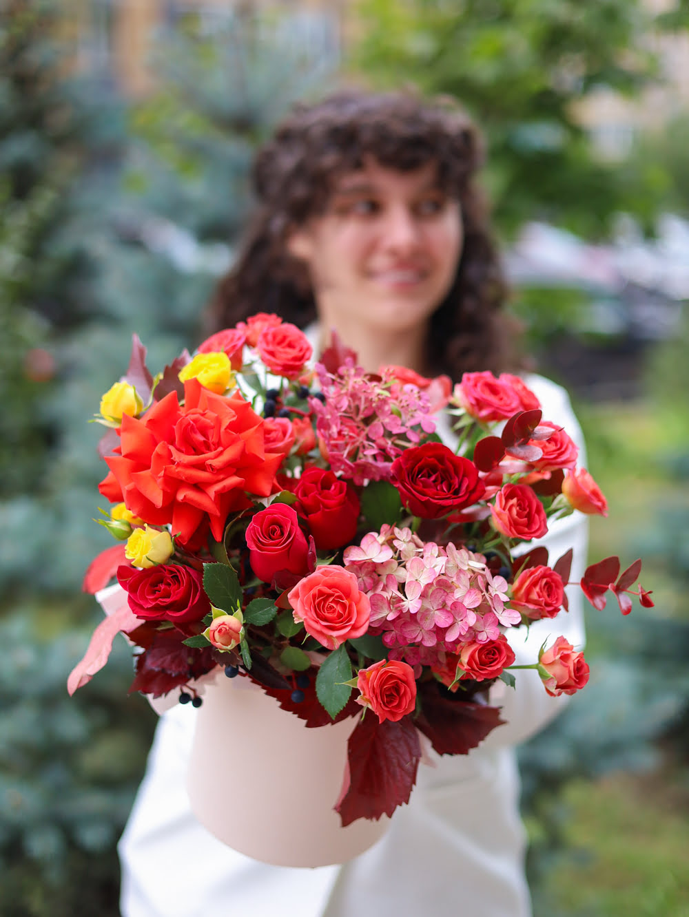 Состав: пышные гортензии, французские, одноголовые и кустовые розы, крашеная зелень.