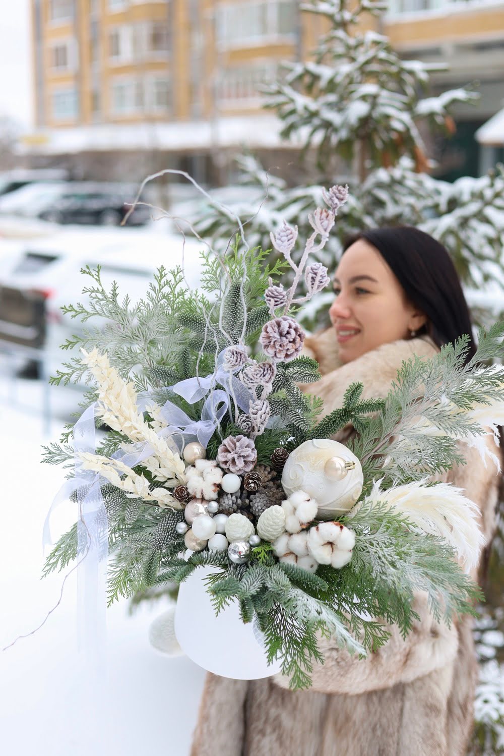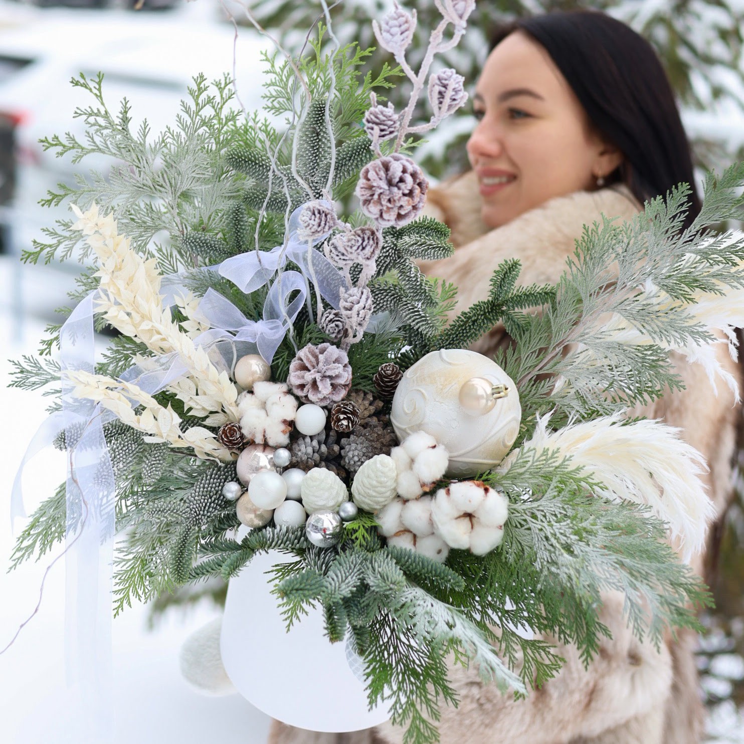 Роскошная зимняя композиция в белой гамме в шляпной коробке припорошенная снегом.