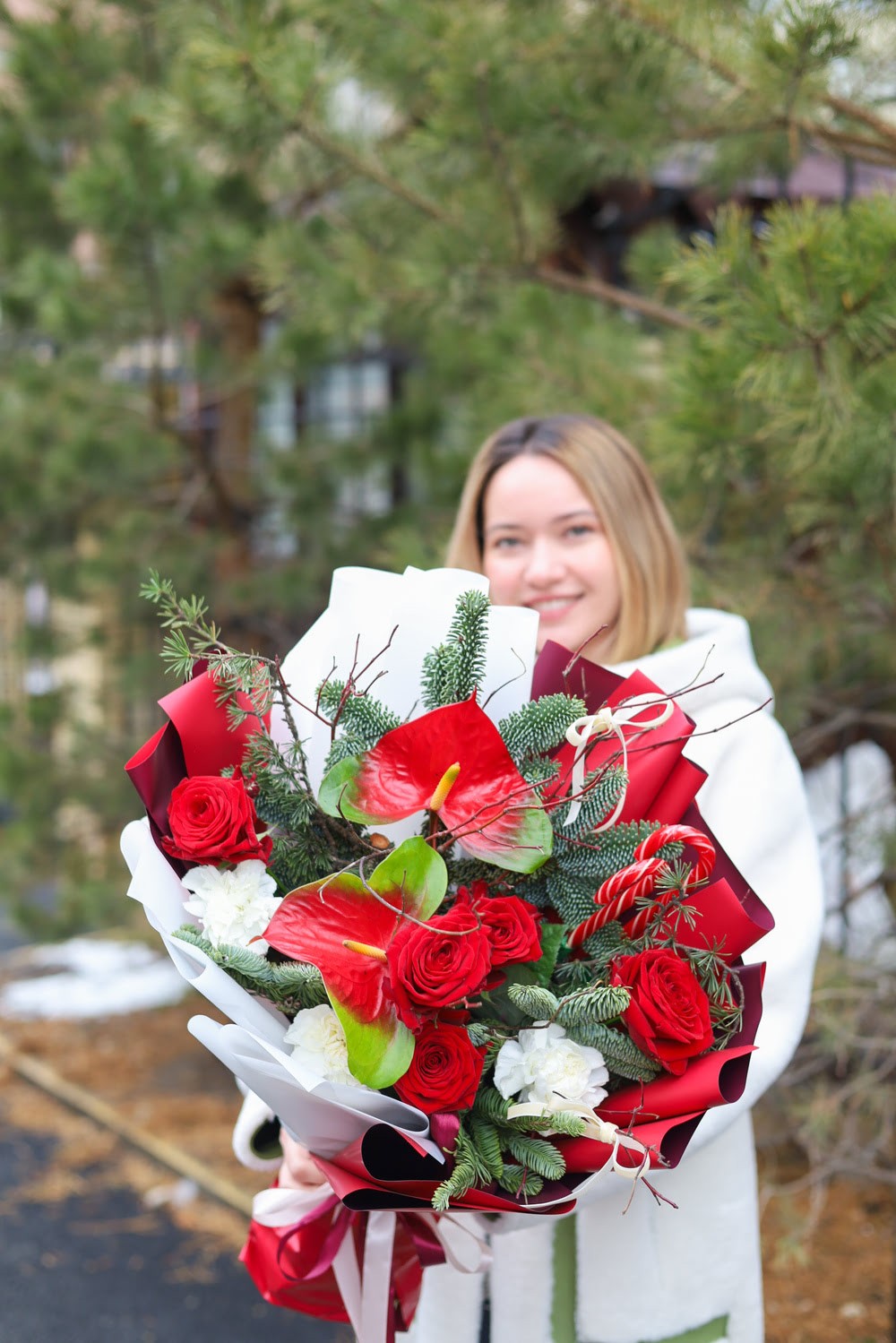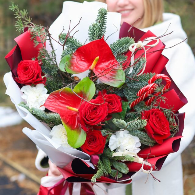 Состав: экзотические антуриумы, одноголовые розы, стойкие диантусы, натуральная ель нобилис, леденцы. Высота около 55 см.