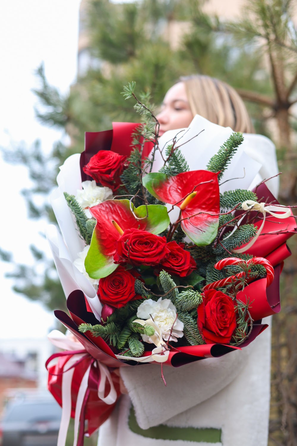 Невероятный зимний букет в рождественской гамме в стильном оформлении.