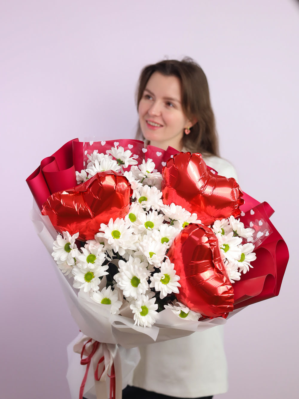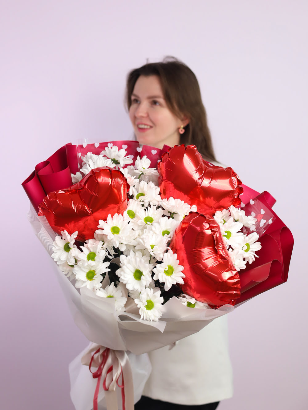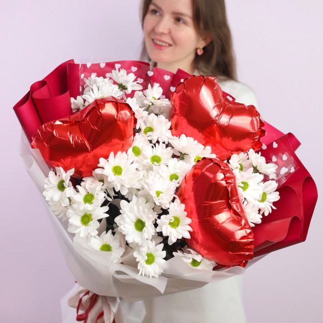 Состав: кустовая ромашковидная хризантема, шары в виде сердца.