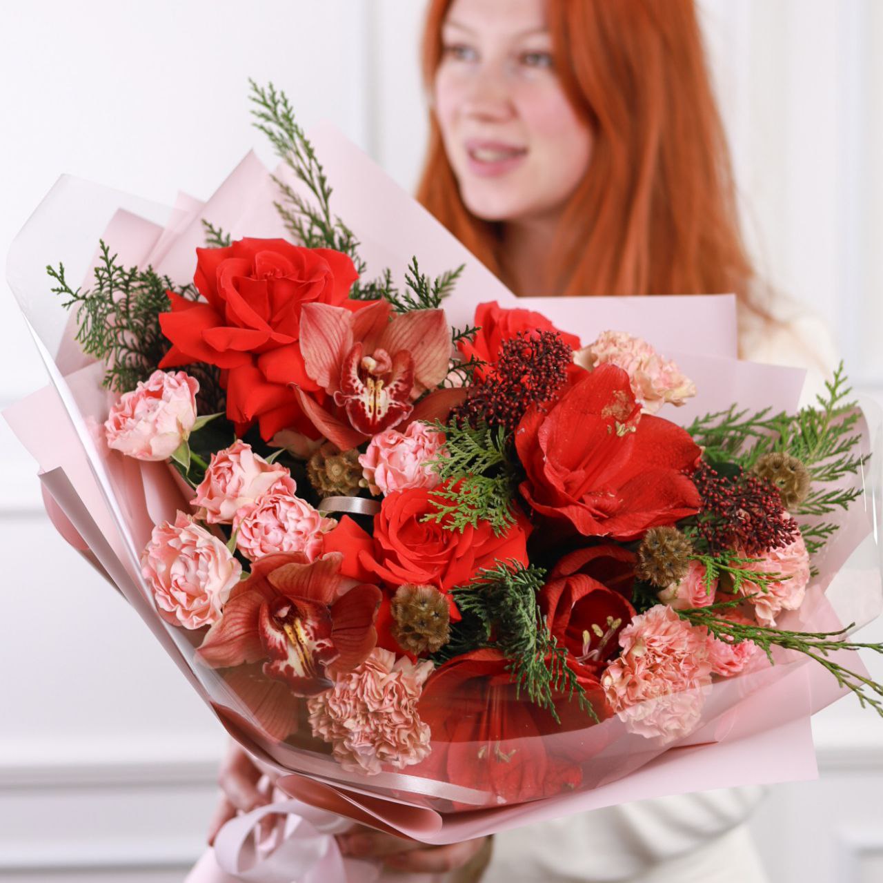 Потрясающий букет с амариллисом, орхидеей, французской розой, стойким диантусом, скабиозой, кустовой пионовидной розой и туей в оформлении.