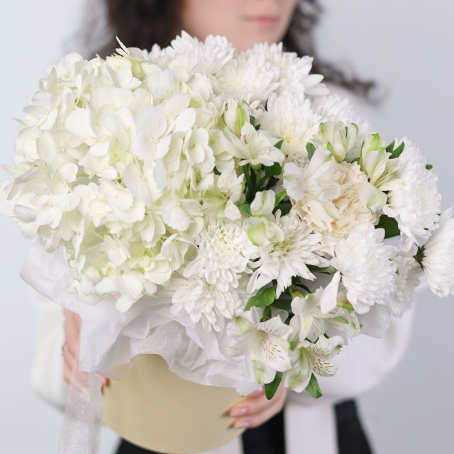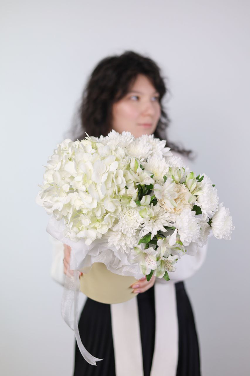 Воздушная композиция с гортензией, альстромерией, стойким диантусом и хризантемой в шляпной коробке.
