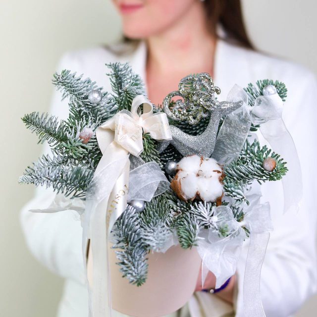 Композиция нобилиса, декоративных игрушек и хлопка в шляпной коробке.