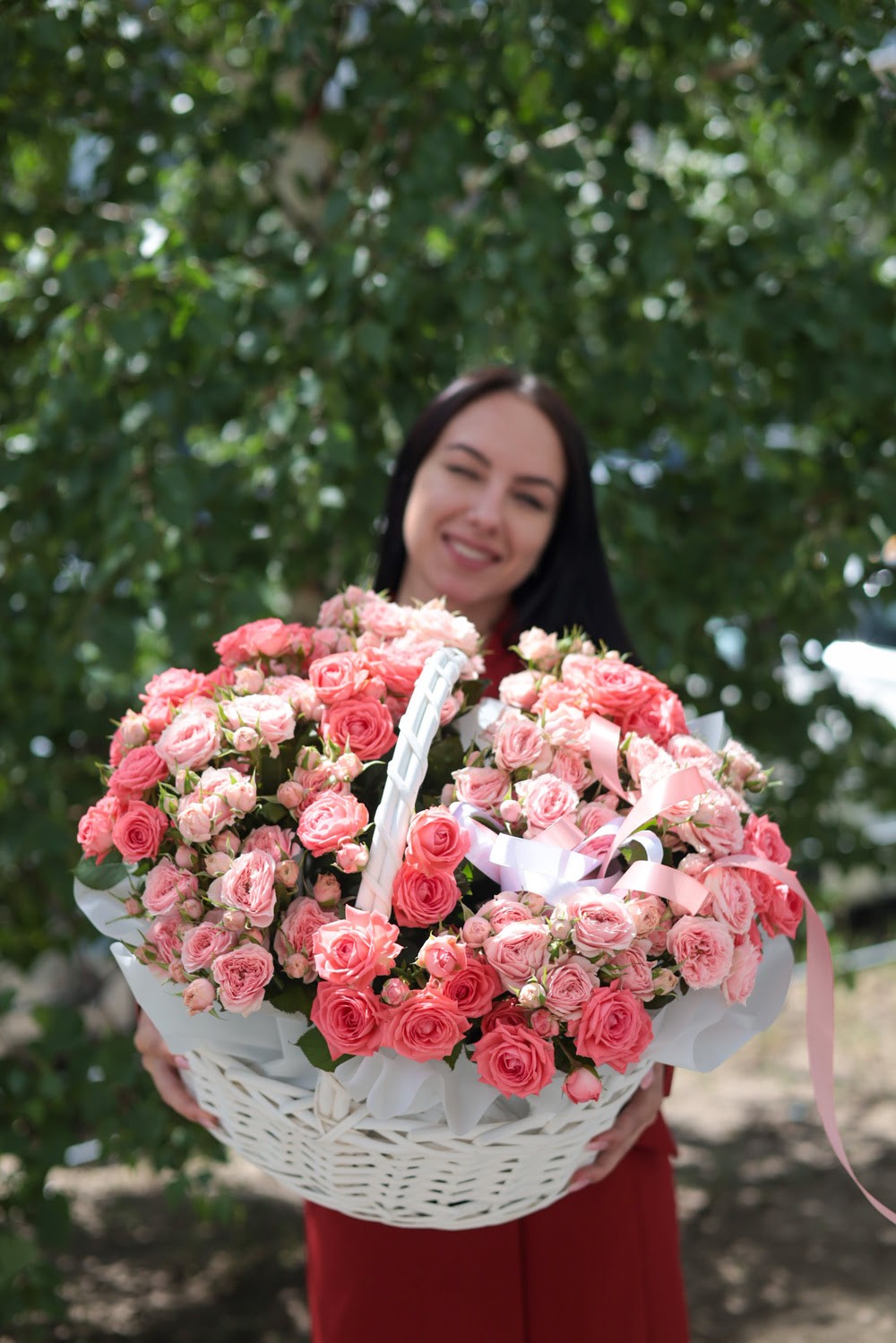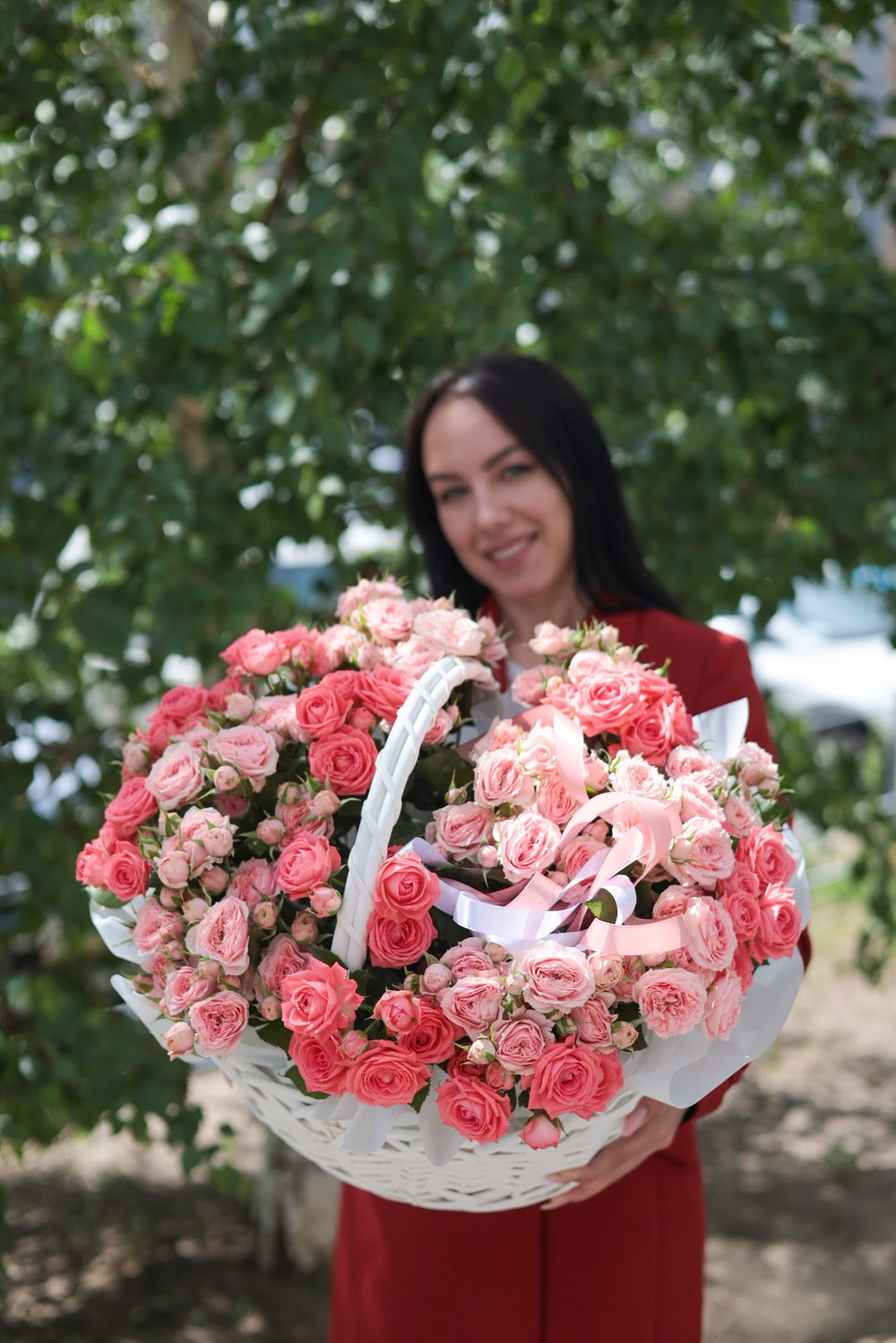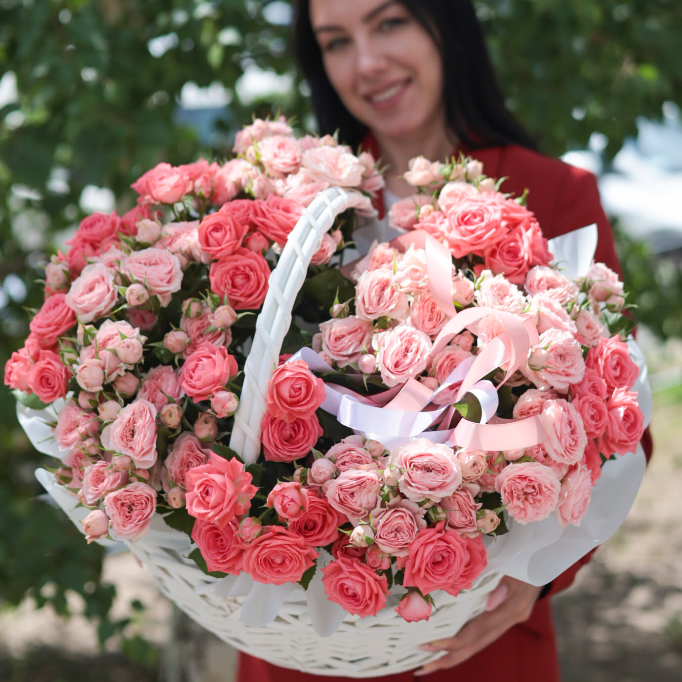 Роскошная композиция кустовых коралловых и нежных пионовидных кустовых роз в плетеной корзине.