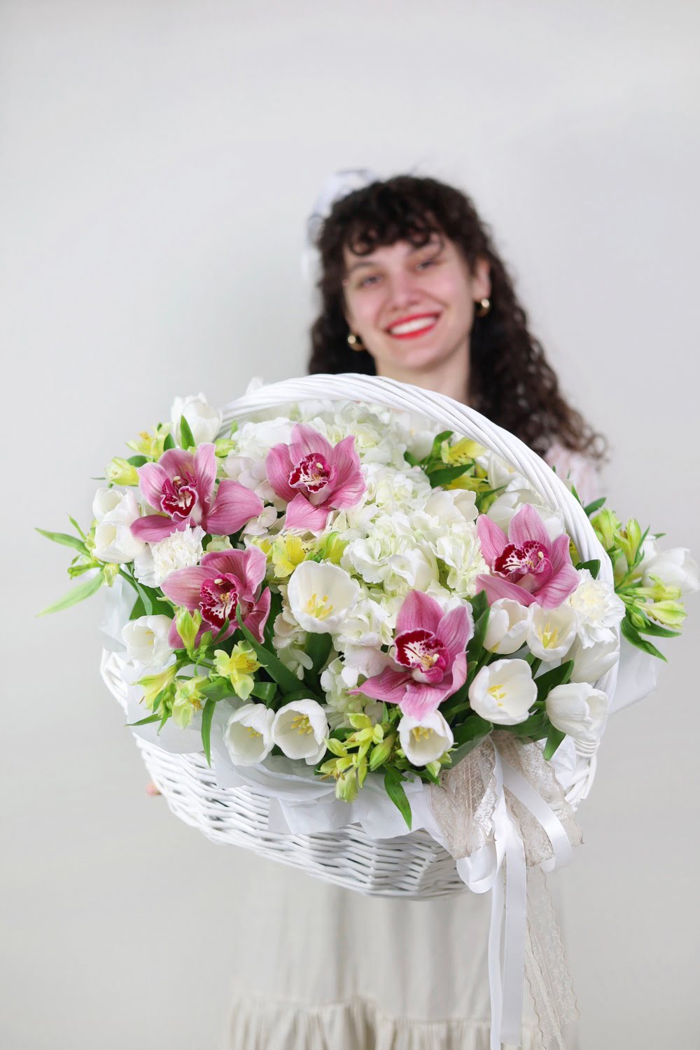 В композиции: пышные гортензии, стойкие орхидеи, диантусы и альстромерия, тюльпаны.
