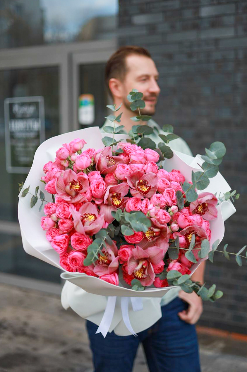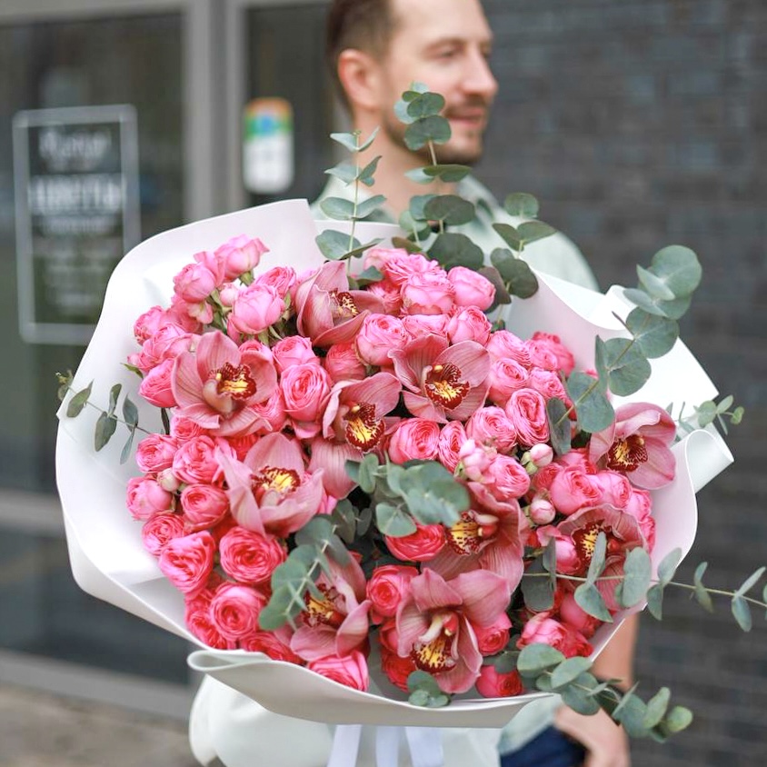 Состав: крупные кустовые пионовидные розы, стойкие ароматные орхидеи, душистый эвкалипт.