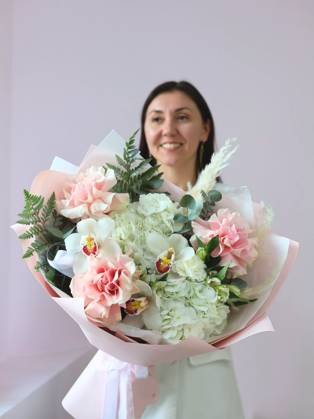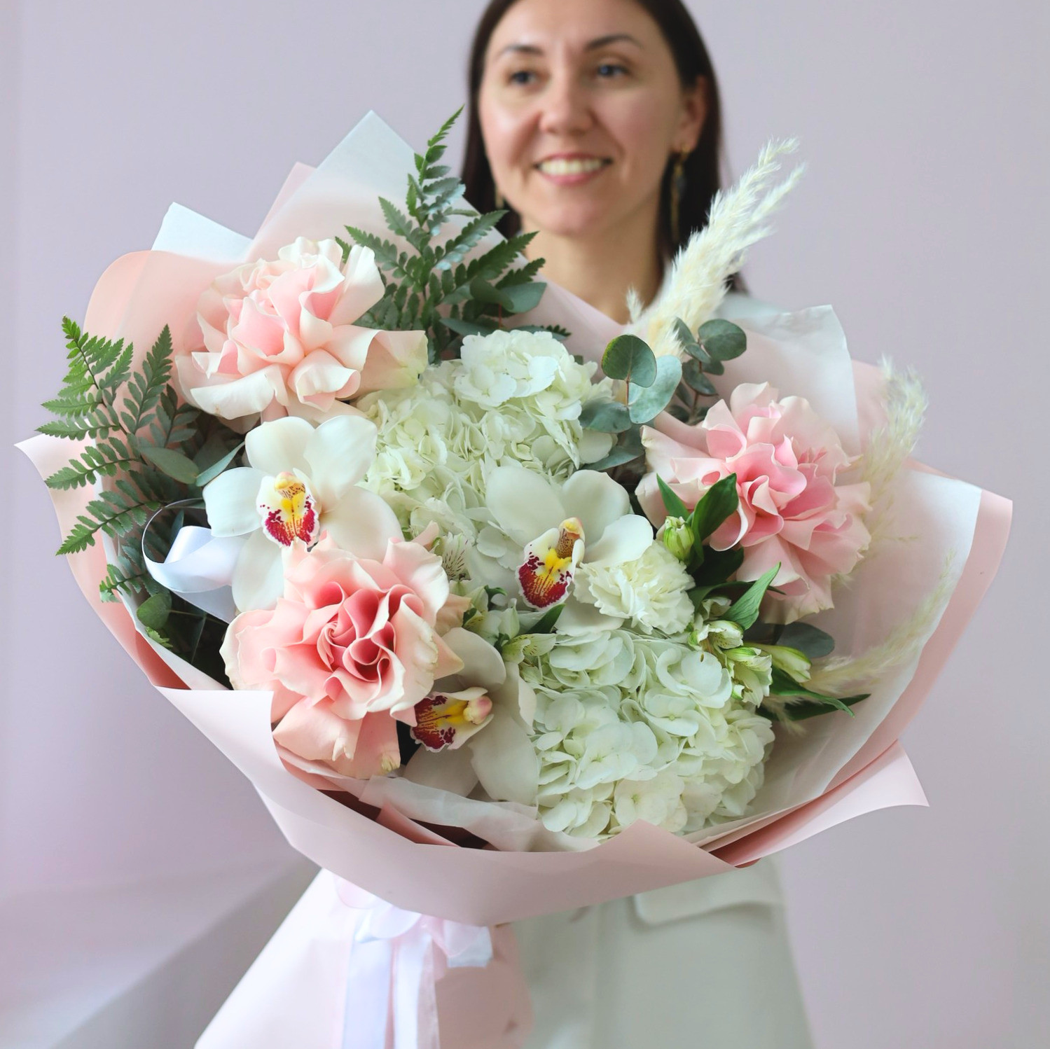 Состав: пышные гортензии, французские и кустовые розы, стойкие орхидеи и альстромерия, сухоцветы, эвкалипт, папоротник.