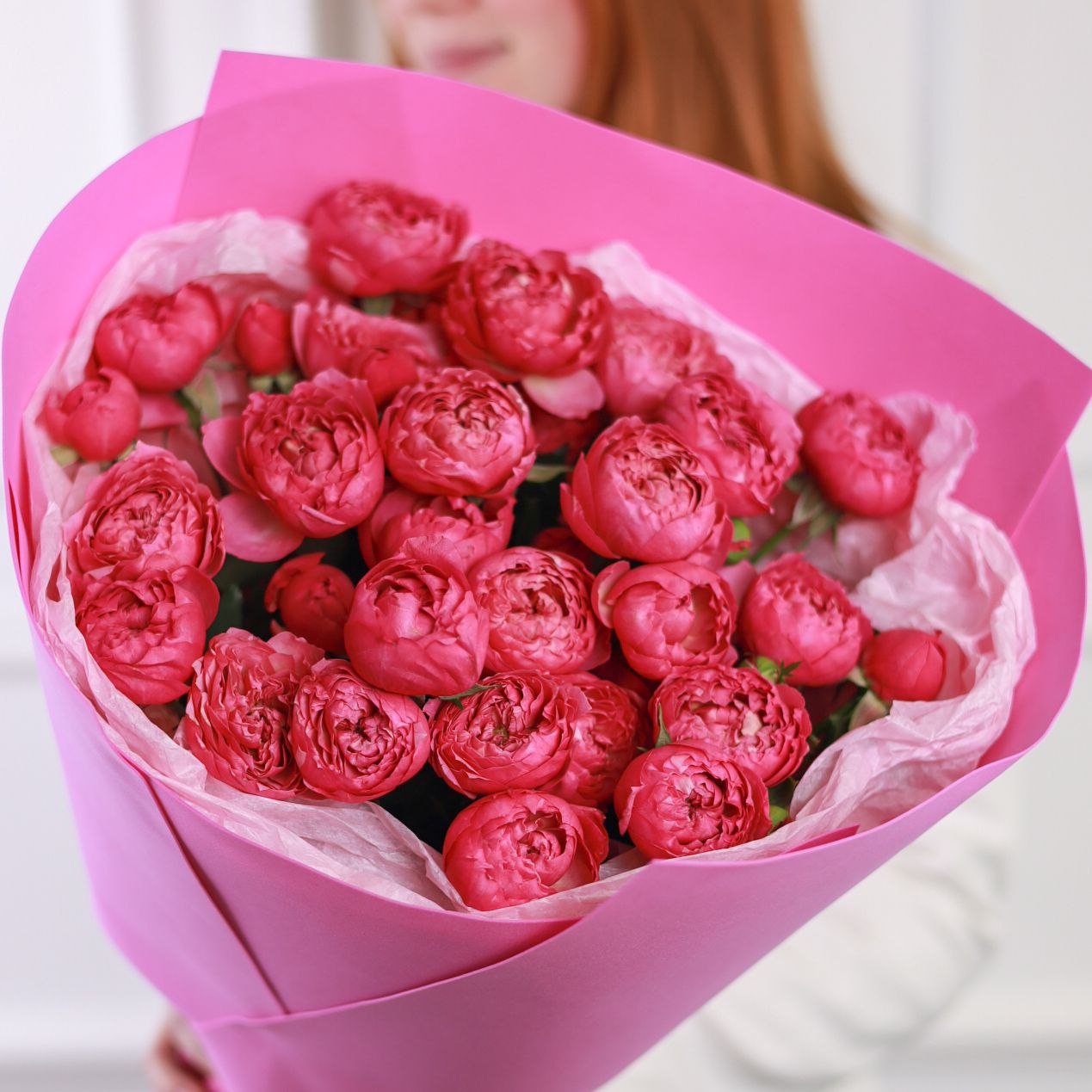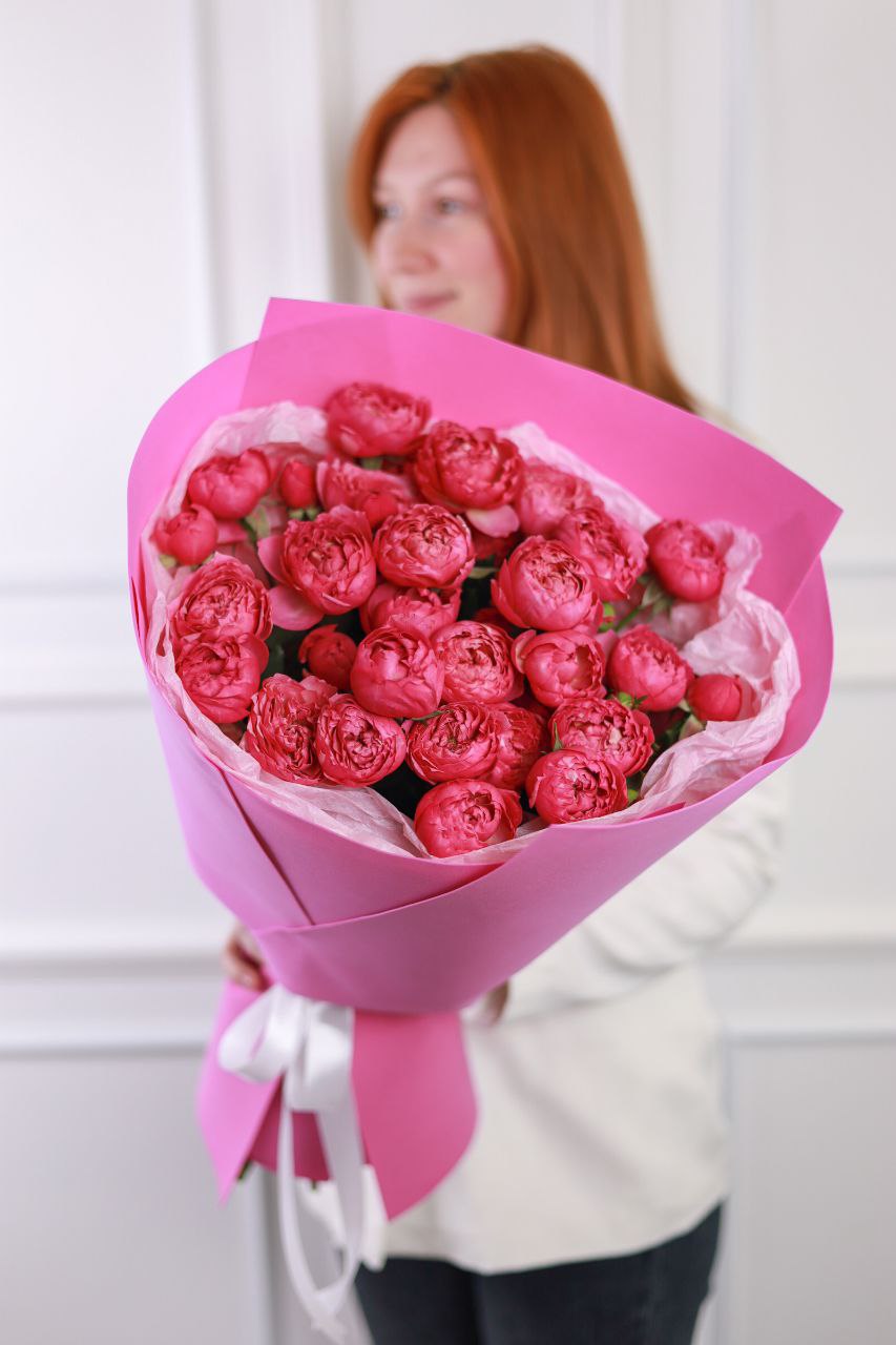 Букет из 9-ти веток кустовых пионовидных роз в оформлении.