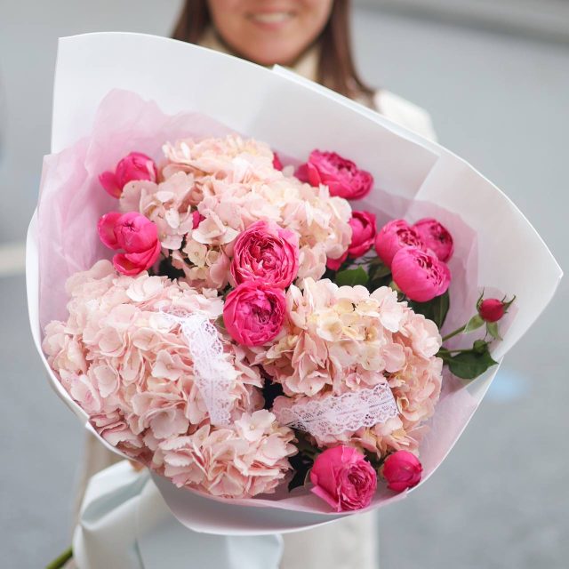 Прекрасный букет с пышными гортензиями и крупными кустовыми пионовидными розами в стильном оформлении.