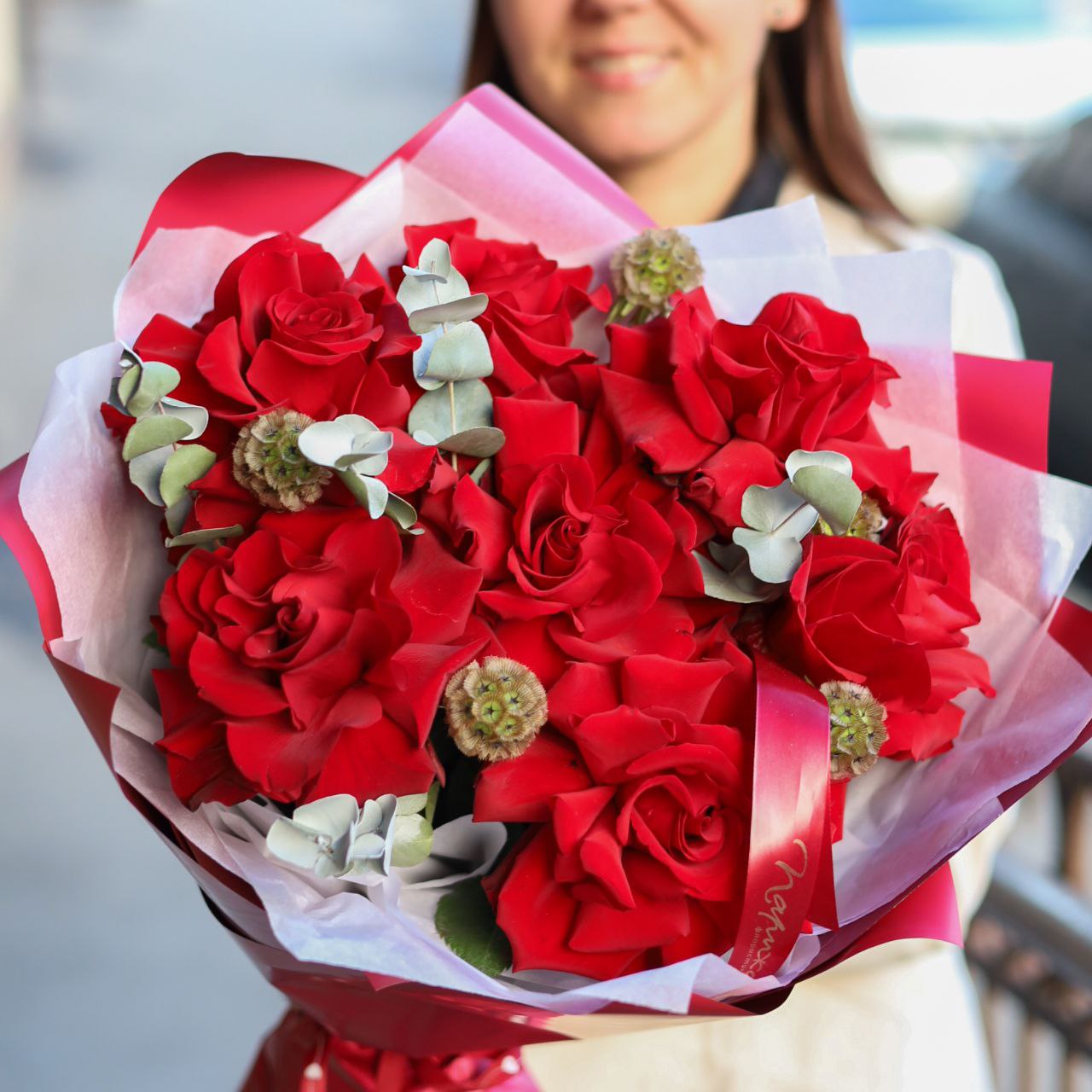 Букет красных роз в оформлении