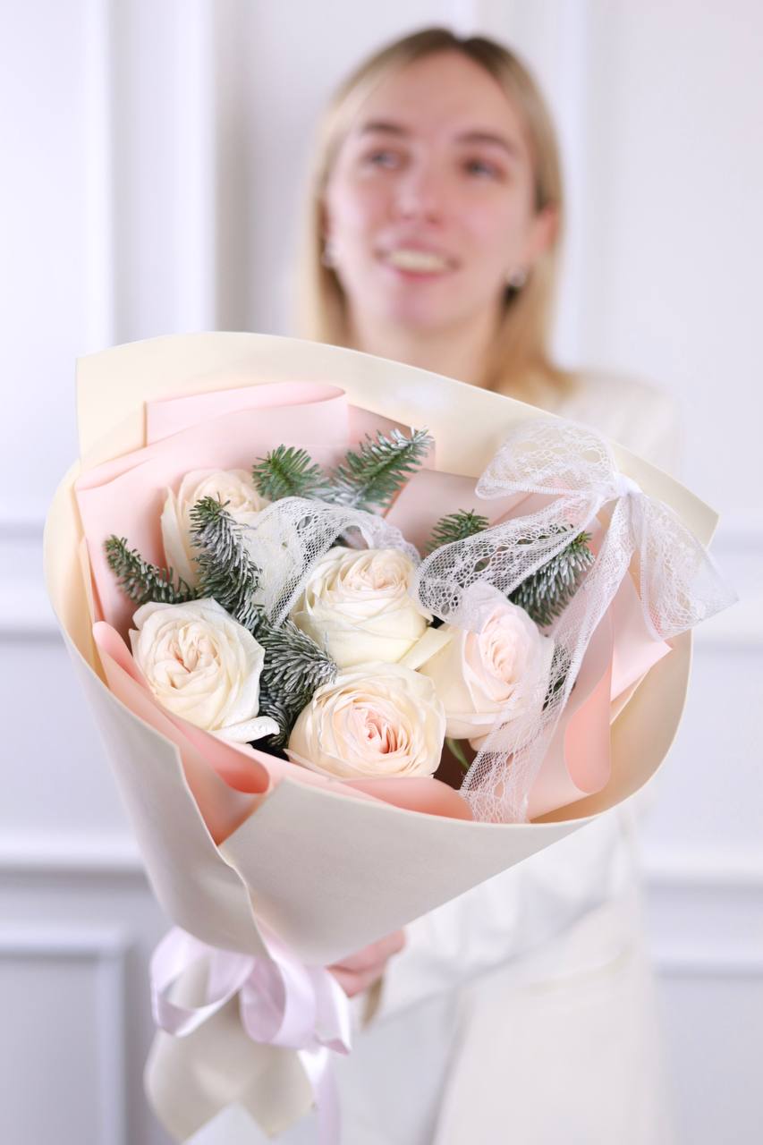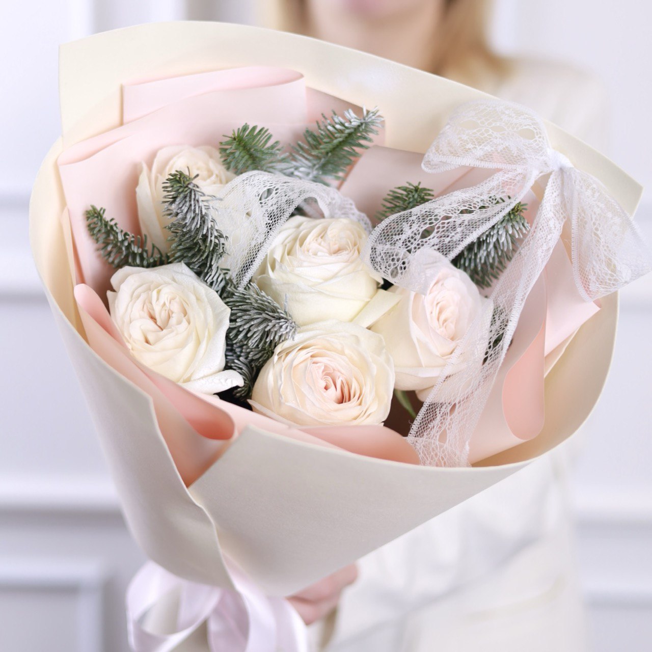 В составе букета 5 одноголовых, ароматных пионовидных роз White O’Hara с нобилисом