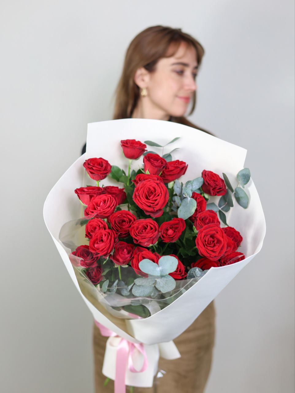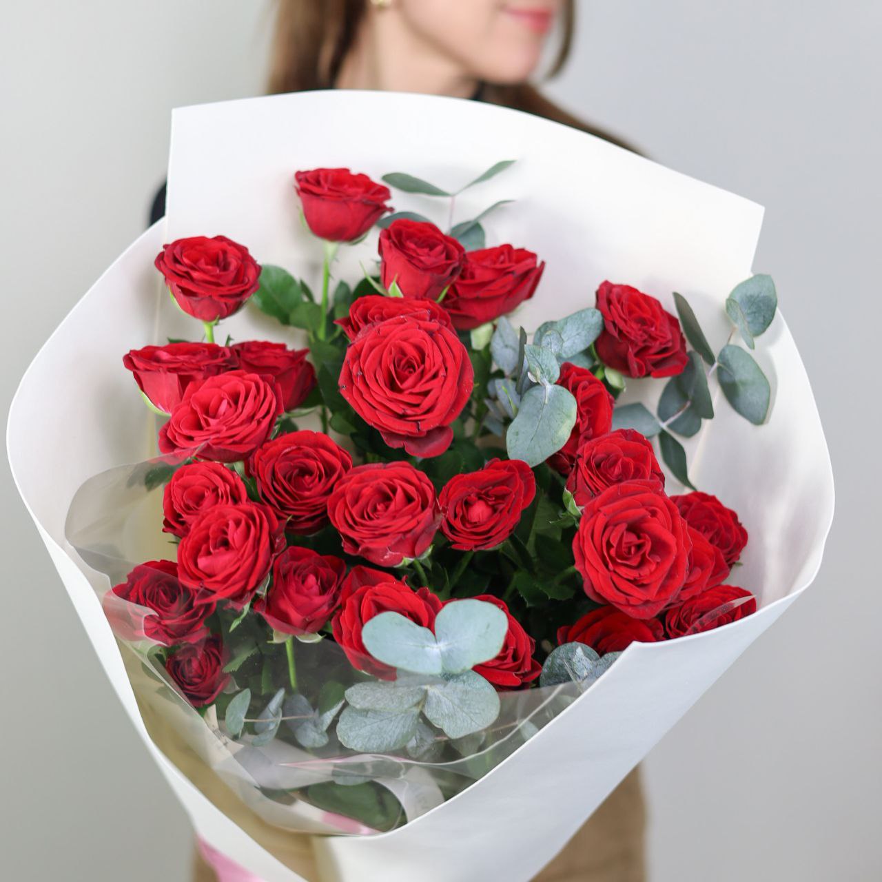 Букет кустовых роз с эвкалиптом в оформлении.