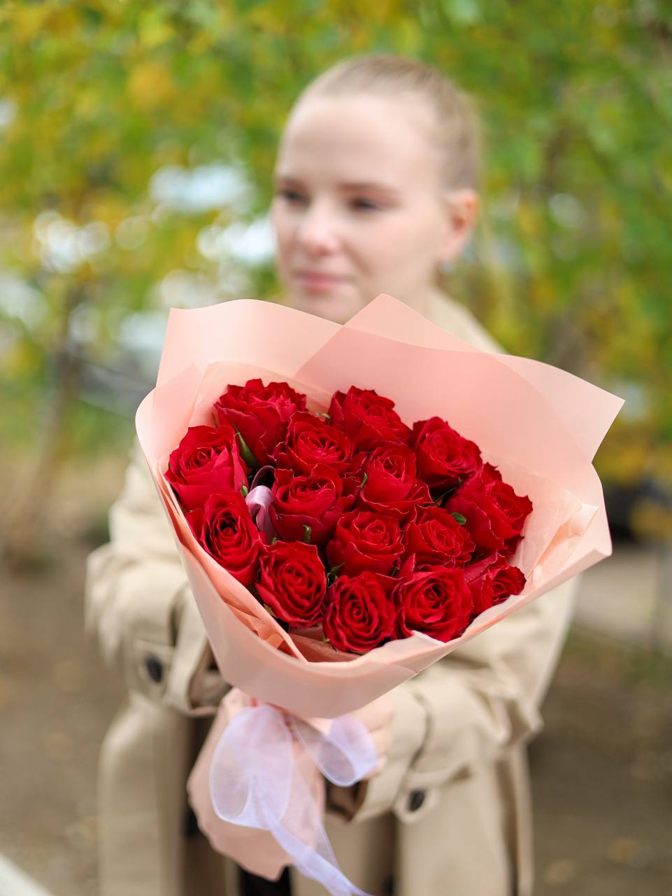 Букет красных роз в оформлении.
