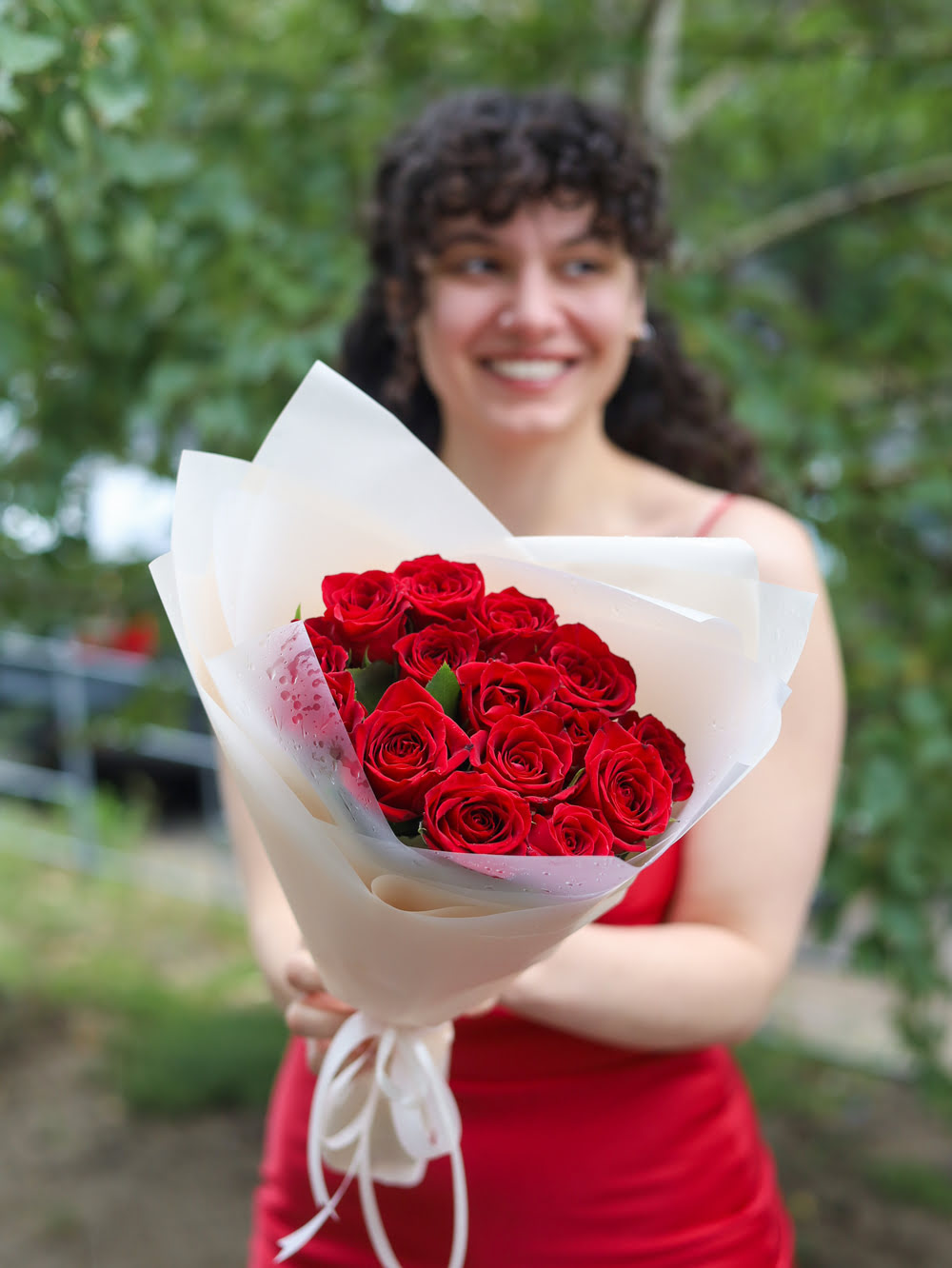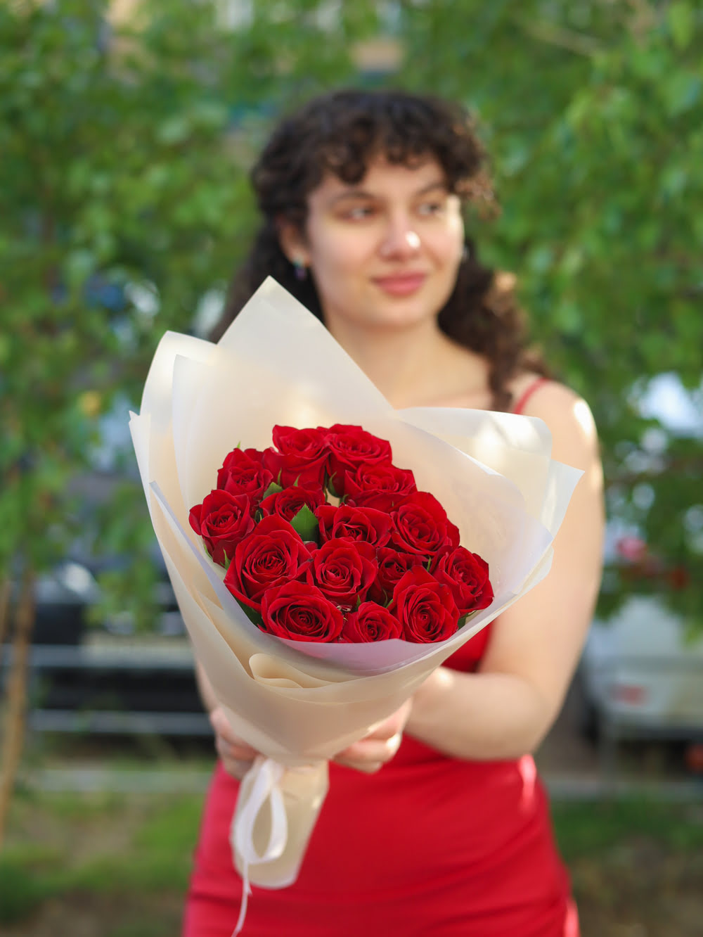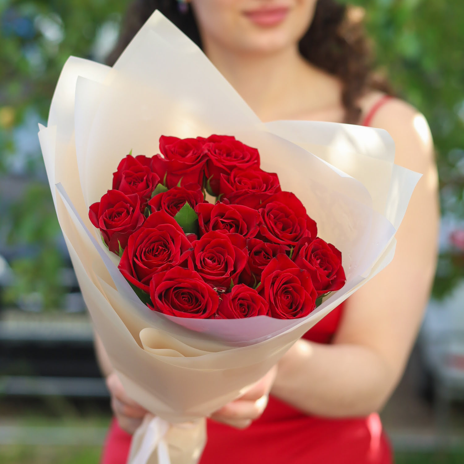 Чудесный букет из 15-ти красных розочек в стильном оформлении.