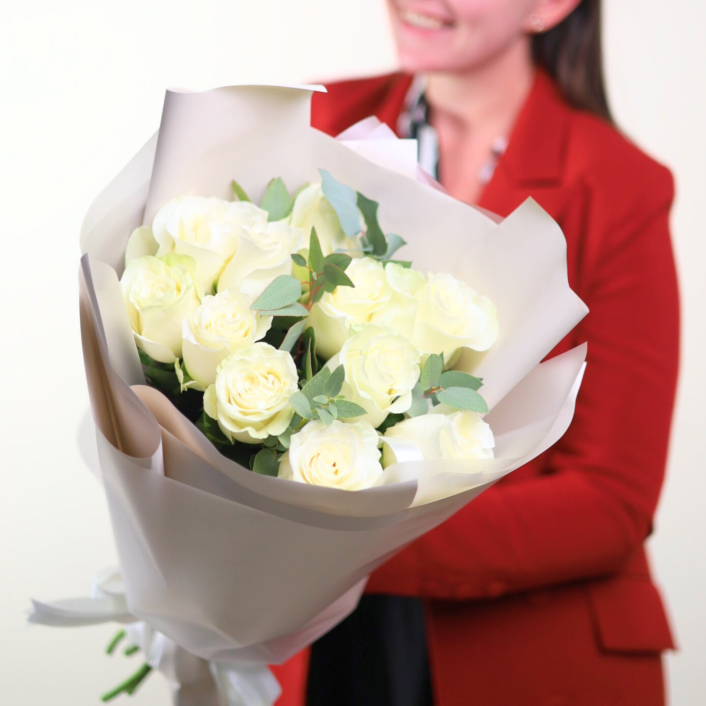 Прекрасный букет из 11-ти белых эквадорских роз с душистым эвкалиптом в оформлении.