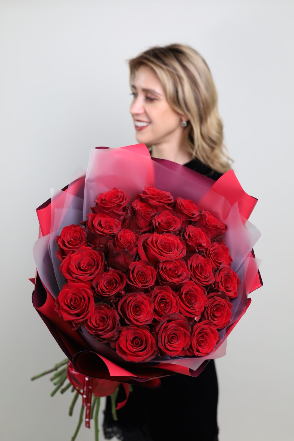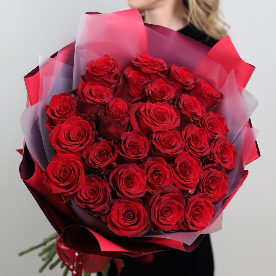 Букет из 25-ти потрясающих бордовых роз Эквадор. Розы будут оформлены в красивую матовую пленку.