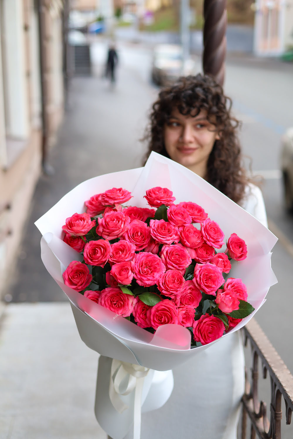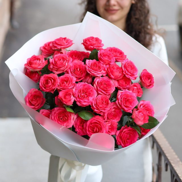 Великолепный стильный букет из ярких кустовых пионовидных роз в оформлении.