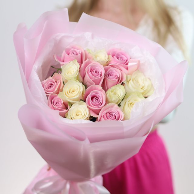 Красивый букет из 15 роз микс белого и розового цвета в оформлении.