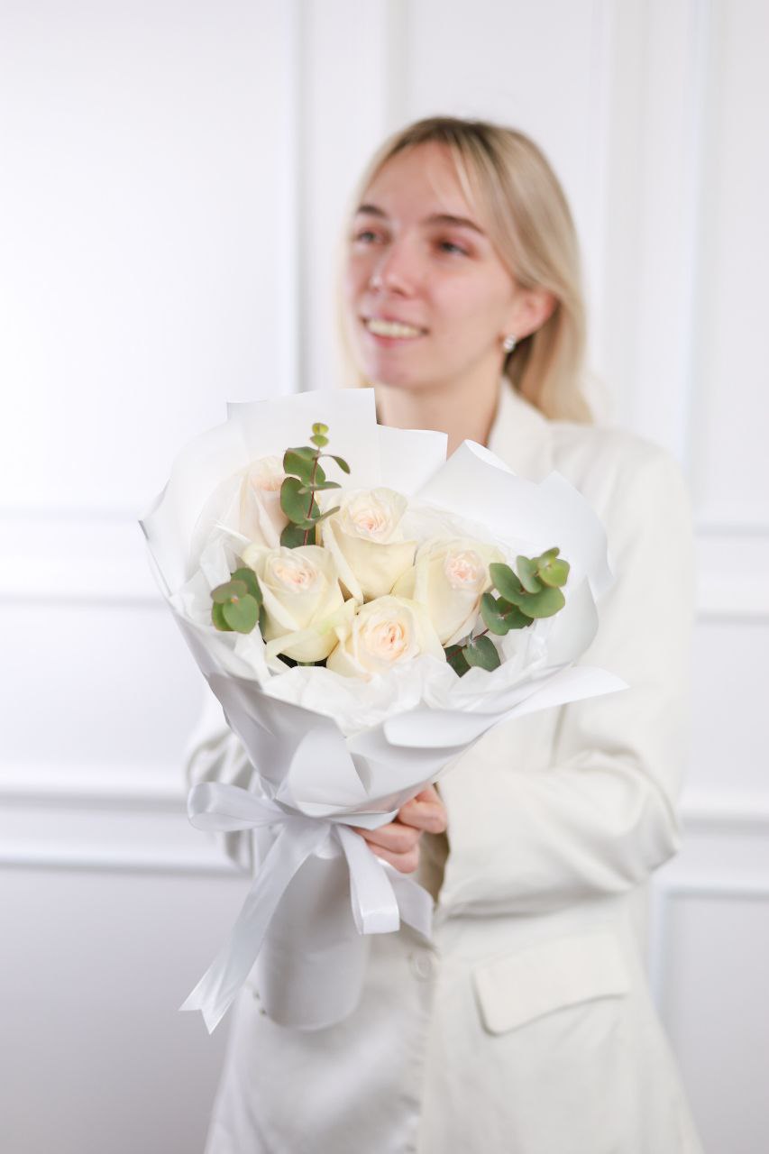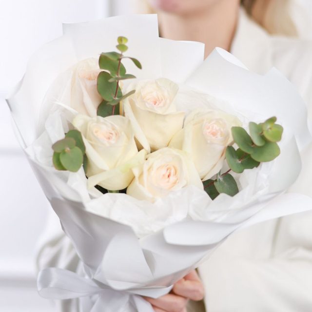 Букет в оформлении с пионовидными розами Охара с эвкалиптом.